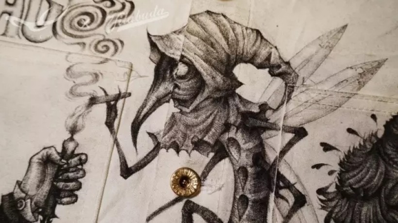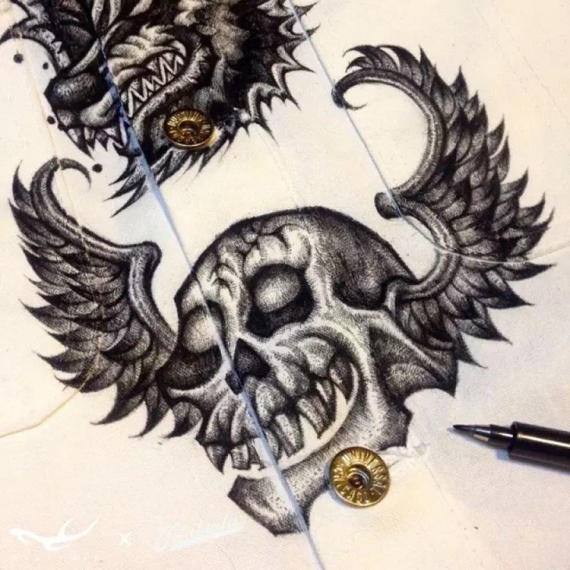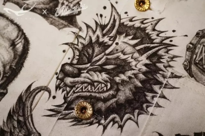田桑是一位资深的美式复古服饰文化发烧友。他从美国购买了一件 70年代Universal Overalls Stone Cutter的白棉布工装,希望找到理念一致的插画师,将这件衣服画满。题材可以完全自由发挥。我们碰面后一拍即合,决定由他来主导图案选题,我来全权负责绘画设计,我们一起把这件事当做一个服装艺术实验项目来做。