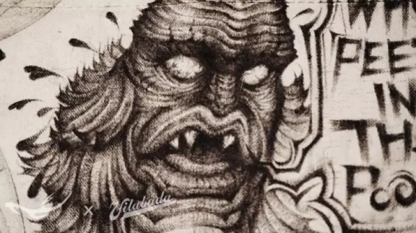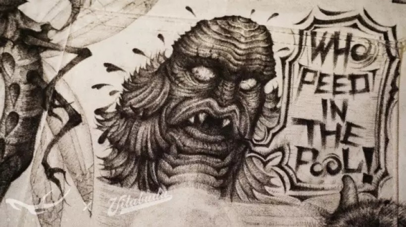 这个水鬼的形象来自著名的“Universal Monsters”系列中的“Creature From The Black Lagoon”角色。此图的灵感是来自美国住宅泳池的告示画。其实就是禁止在泳池小便的意思。知道这个典故的人能看懂是怎么回事,而不知道的人又会觉得很生动有趣。便将此创意引用到了这次图形企划中。