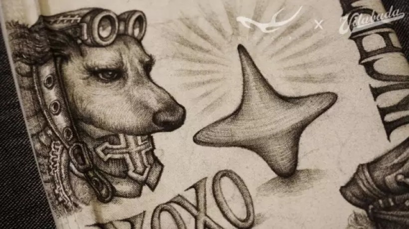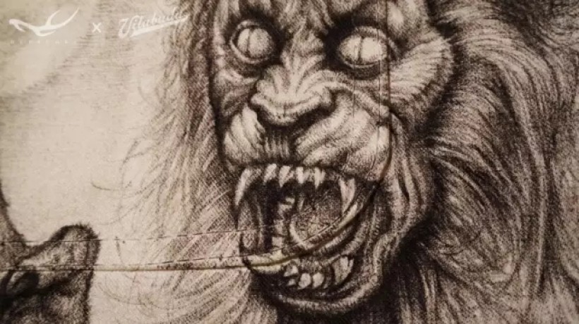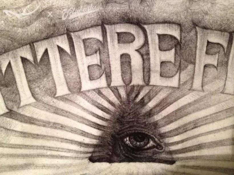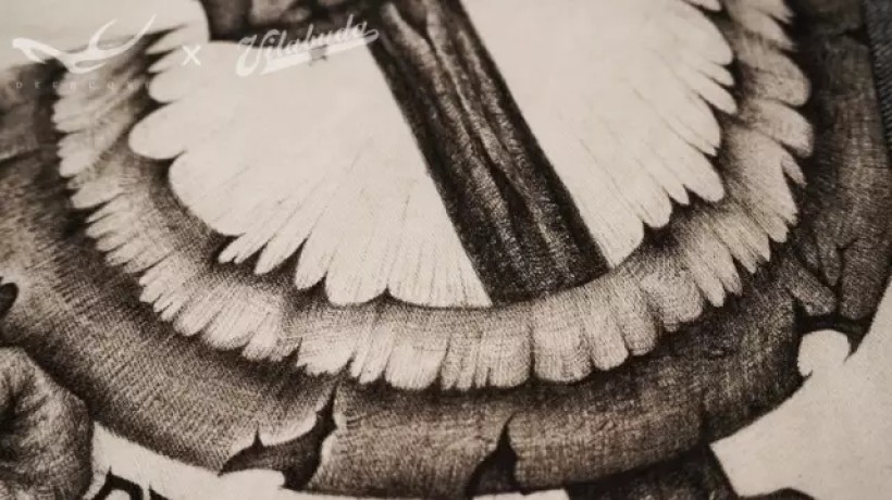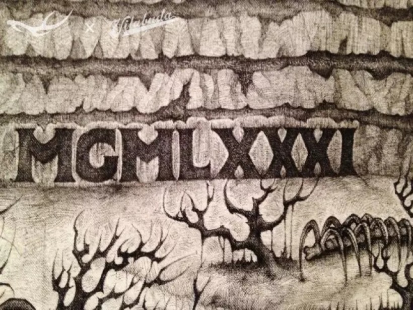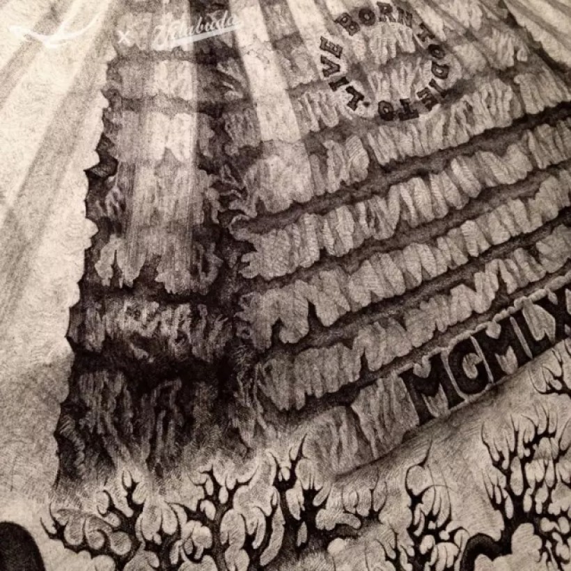 美元原图金字塔底部塔基位置的罗马数字MDCCLXXVI代表1776年独立宣言的签署年份,而我画的这张图金字塔底座放置的MCMLXXXI罗马数字代表我的合作伙伴田桑本人的出生年份1981。悬浮于金字塔顶端的、著名的“全能之眼”通体漆黑,目光淡漠,仿佛洞察一切的冥界之神,冷眼旁观着一切。