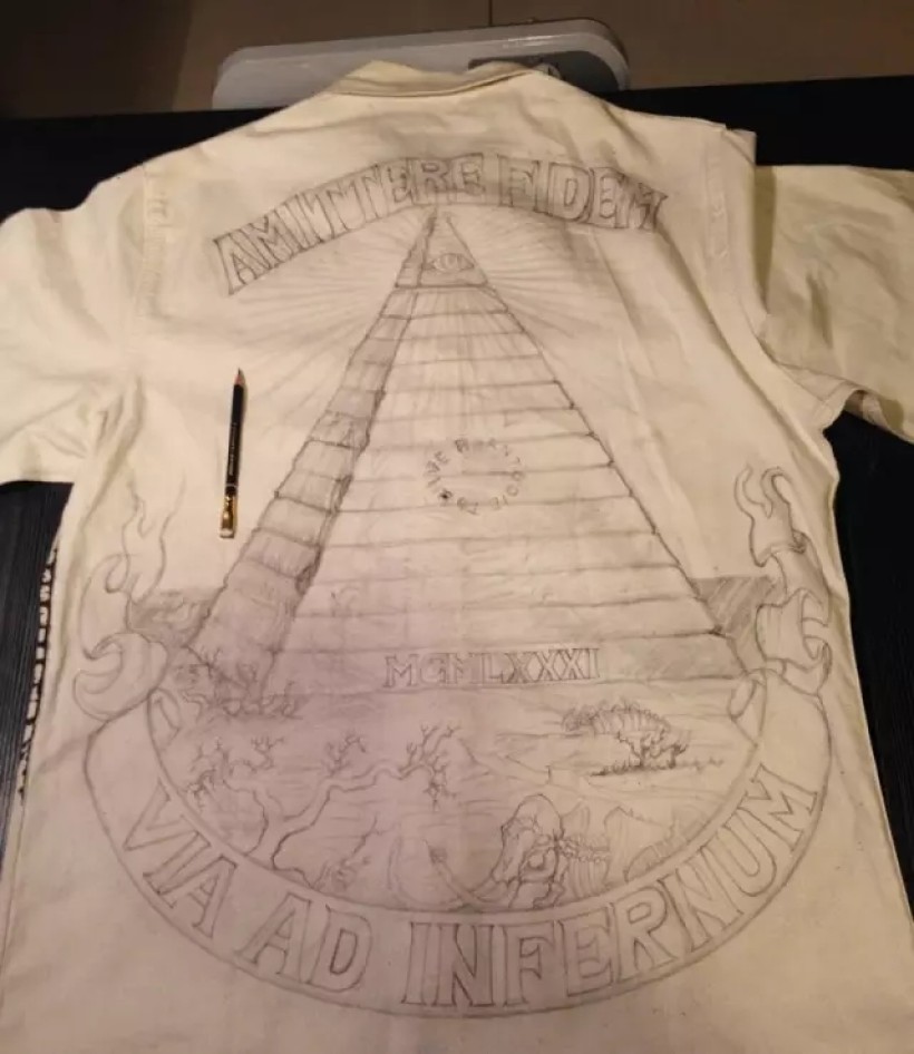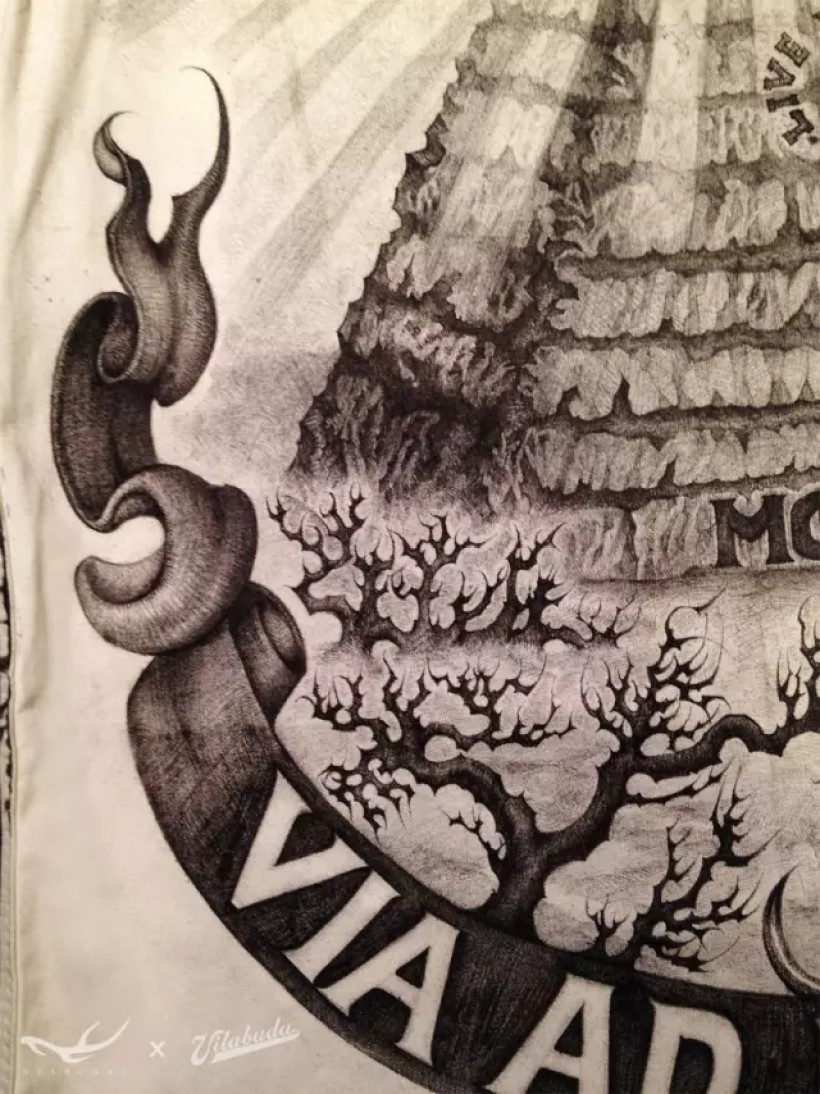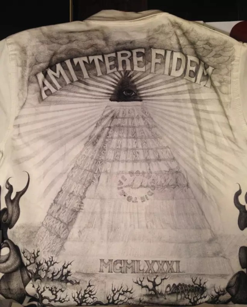 这是此次企划中信息量最大,创作过程中最烧脑的一幅图。所以很有必要做一段很长的注释来表达此作的创作意图。明眼人一看便知这是$1美金背后的共济会金字塔和全视之眼的标志。这幅占据衣服整个后背面积的图案就是要将美元上的金字塔进行一番自己的全新改编和演绎。