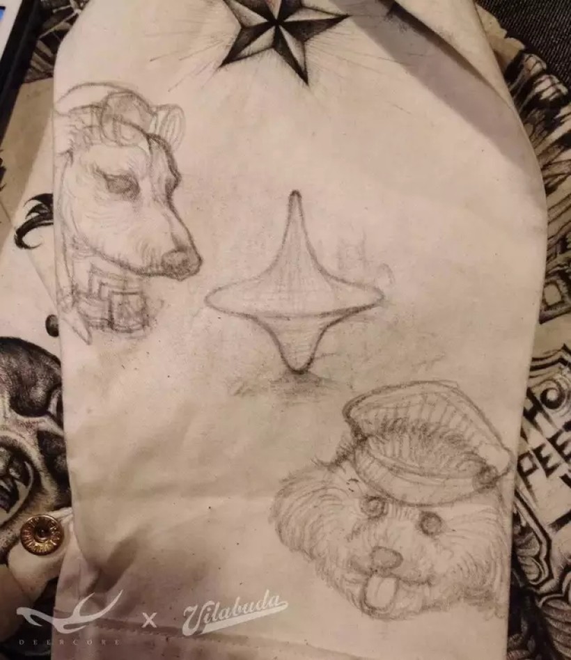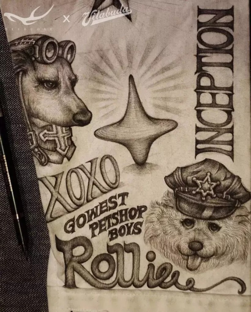 画面主人公是我和合作伙伴养的两只狗。“蒸汽朋克”是我家腊肠犬:XOXO。“美国警察”是田桑家的泰迪犬:Rollie。陀螺来自电影《盗梦空间》。在衣袖的边缘设计了INCEPTION的全新字体。