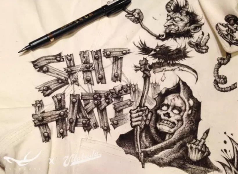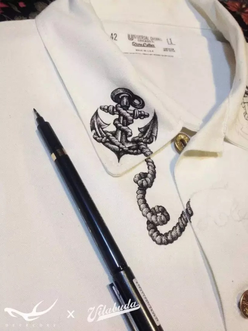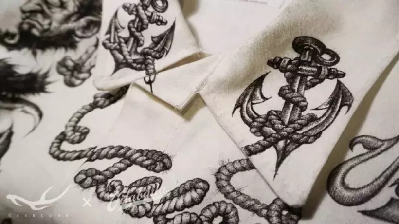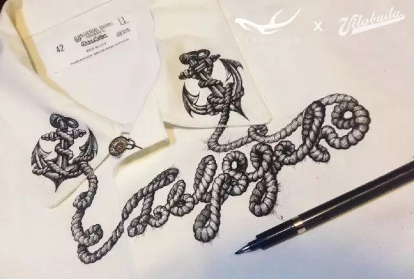 “Totalpsycho”是我的合作伙伴田桑在社交网络上的ID。衣服的第一个图案设计就准备“搞一搞”他的ID。我将这个英文词组设计成了船锚和绳索结合的形式。绘制在衣领和胸前的位置。