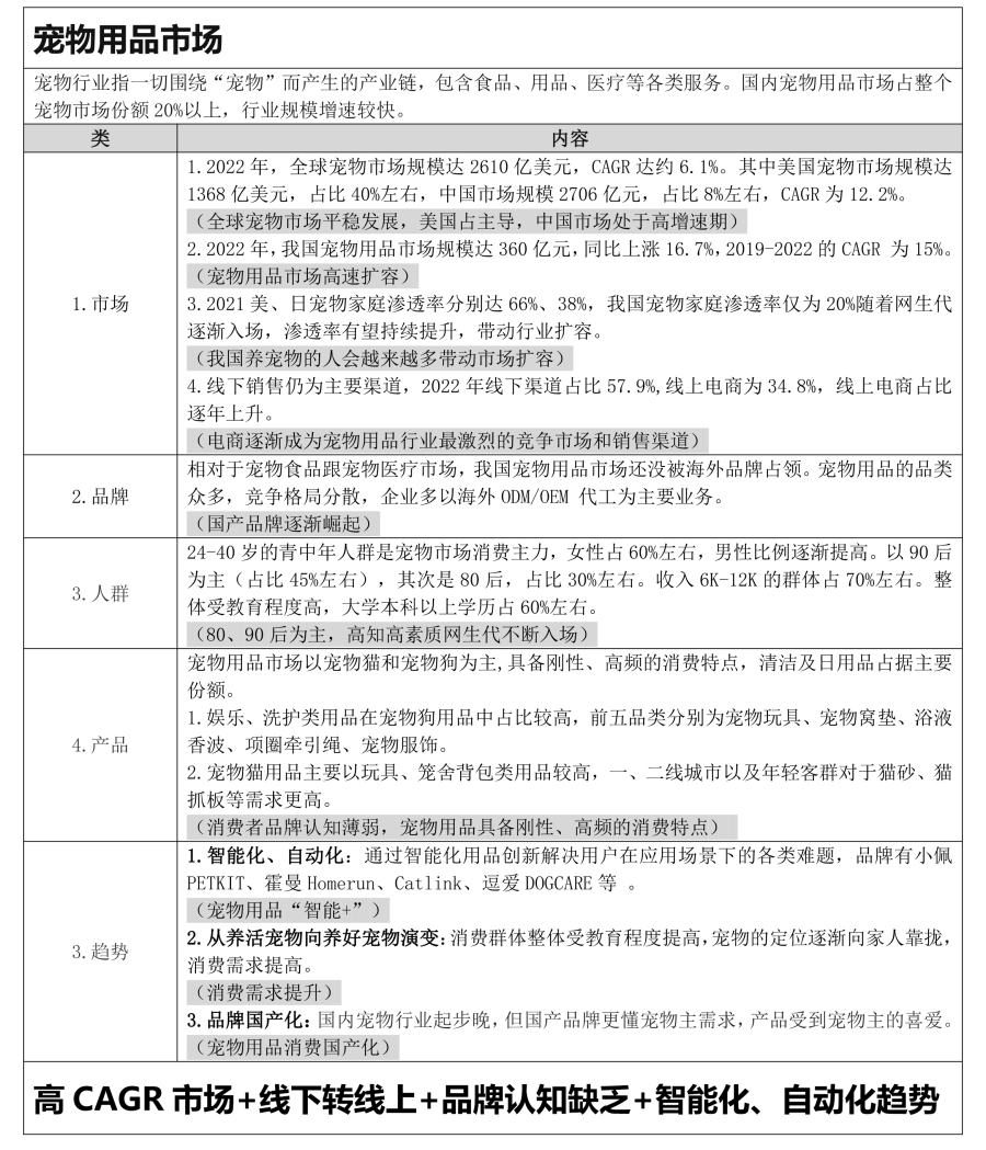 宠物用品市场近几年蓬勃发展,以下是对于宠物用品市场的一些见解: