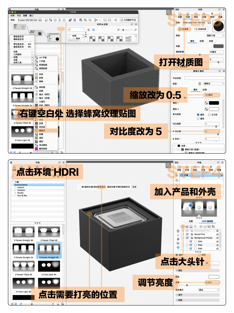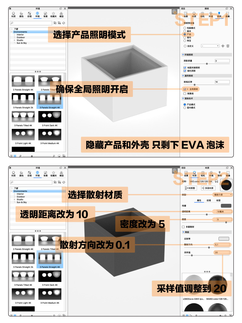 🟠 首先在keyshot里隐藏产品和外壳,只剩下泡沫,开启产品照明模式,确保全局光照开启,贴一个散射材质,将透明距离改为10,密度改为5,散射方向改为0.1,然后调整采样值到20。打开材质图(电池图),右键空白处选择蜂窝纹理贴图,连接至散射材质,点击蜂窝纹理,缩放改为0.5,对比度改为5。最后加上产品和外壳,由于海绵/泡沫会有部分处于凹陷,所以需要点开环境-HDRI,点击大头针,再点击EVA海绵泡沫需要被打亮的部分,调节亮度即可。