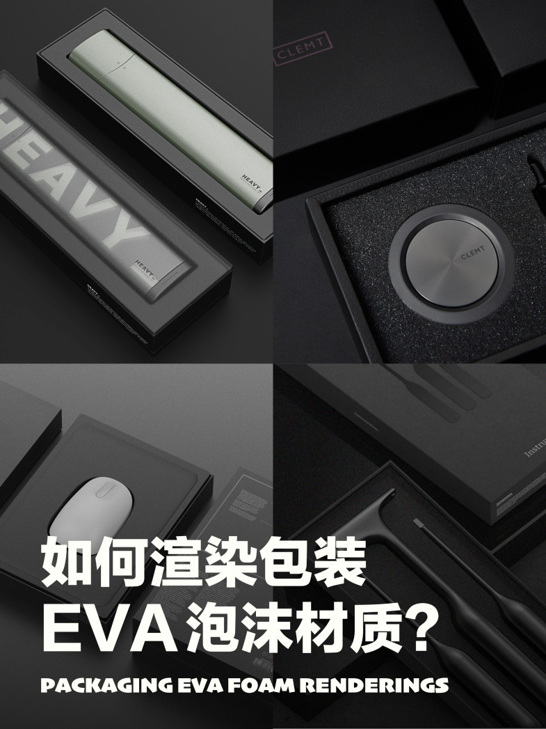 为防止产品在运输,储存过程中因震动而刮花,产品包装里都有EVA发泡橡胶垫或高弹性的海绵聚氨酯(填料),EVA包装盒不仅能防震同时还能防潮,防滑。所以在产品渲染图中经常会需要渲染EVA/聚氨酯海绵/泡沫。