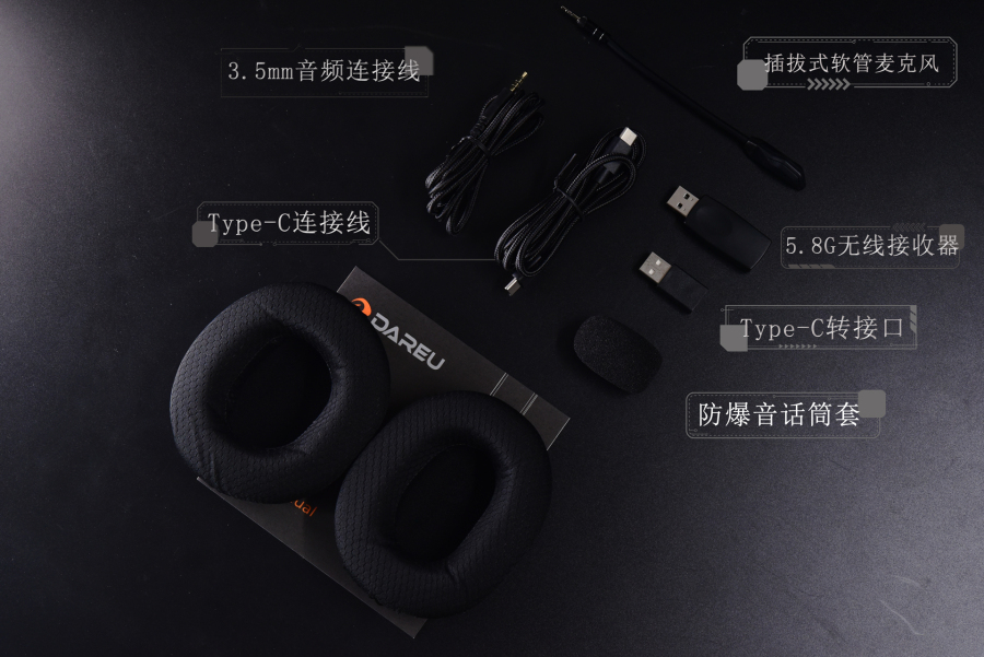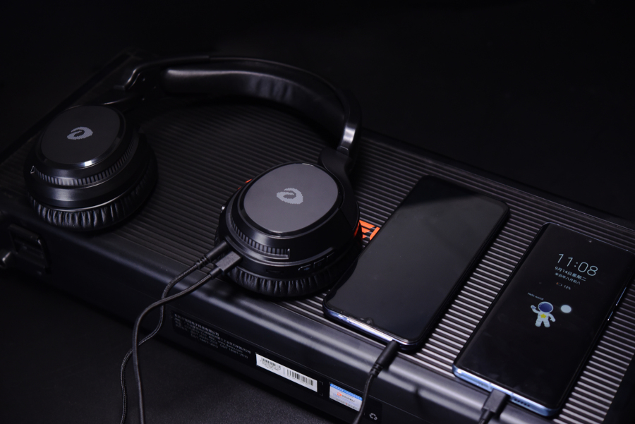 虽然,这款达尔优A710是5.8G无线游戏耳机,但却可以有线连接使用,前面我们看到配件里有一堆线,除了3.5mm连接线以外,还有一条双Type-C头的线,可以直接连接部分没有3.5mm接口的只能手机,就很棒。但是,并没有iPhone接口的线,可惜了iPhone用户。