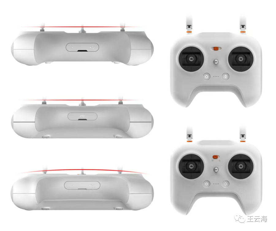 案例2:小米无人机遥控器,从侧视图看,小米选择了侧面有轻微幅度的设计,根据小米设计师的描述,通过实物样品的对比,有轻微幅度设计的控制器手感会更舒适,视觉也不会显得凹陷。