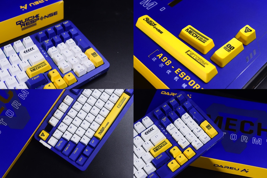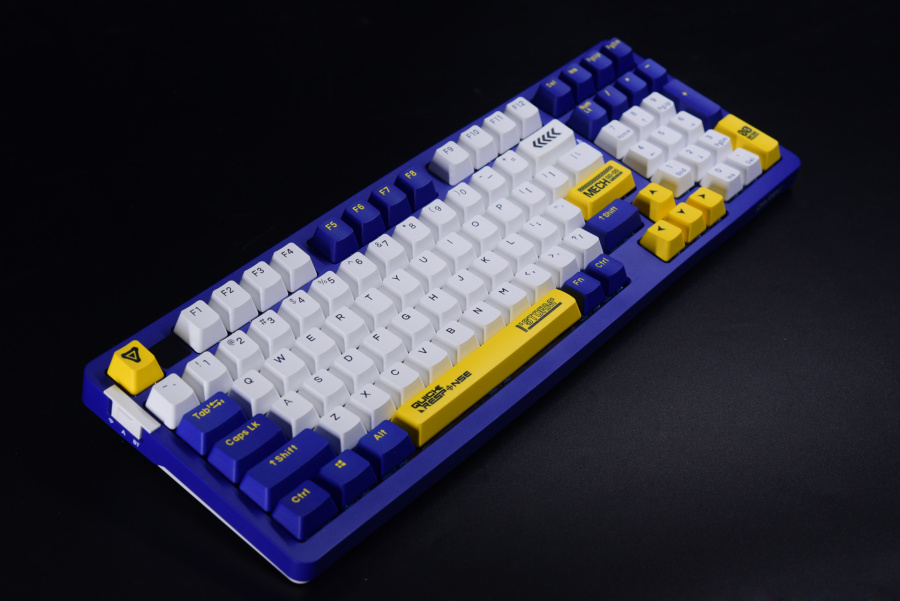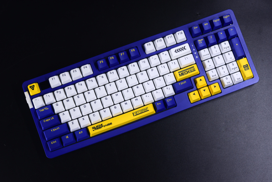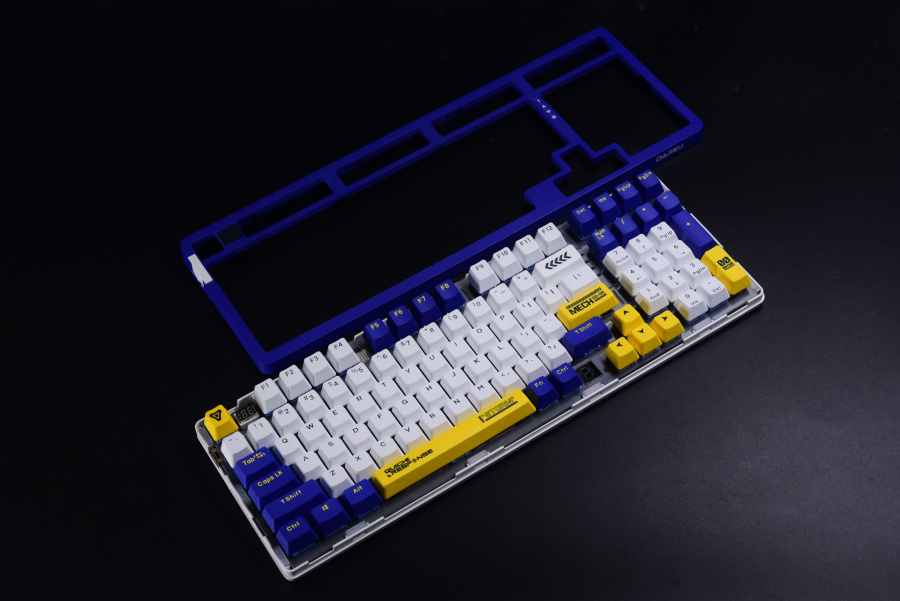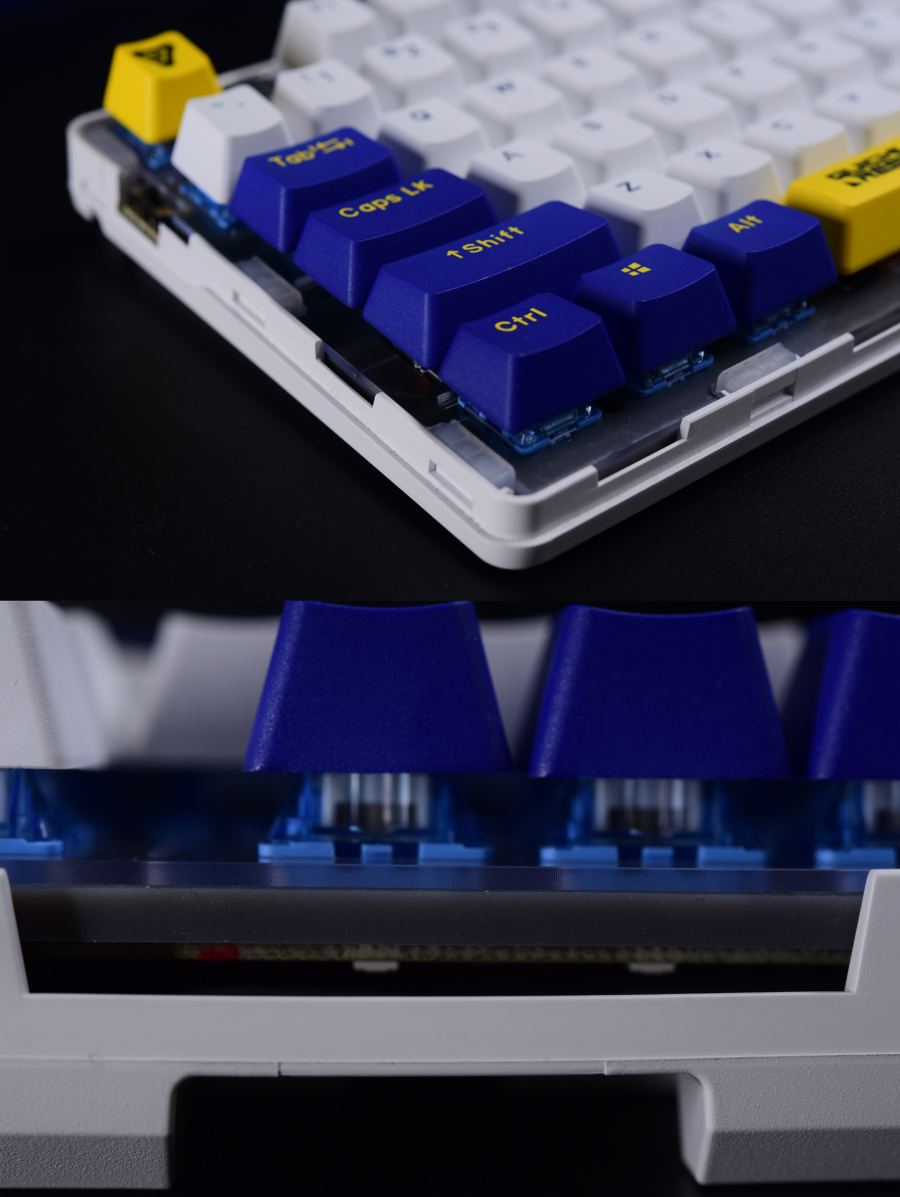 而外观方面则是蓝白搭配,辅以几个黄色的个性键帽组合,营造机甲风,个人感觉除了这几个键帽以外,上盖部分也可以加入一点设计,这样会给人更强的设计感,也让我感觉物超所值。