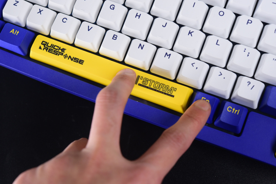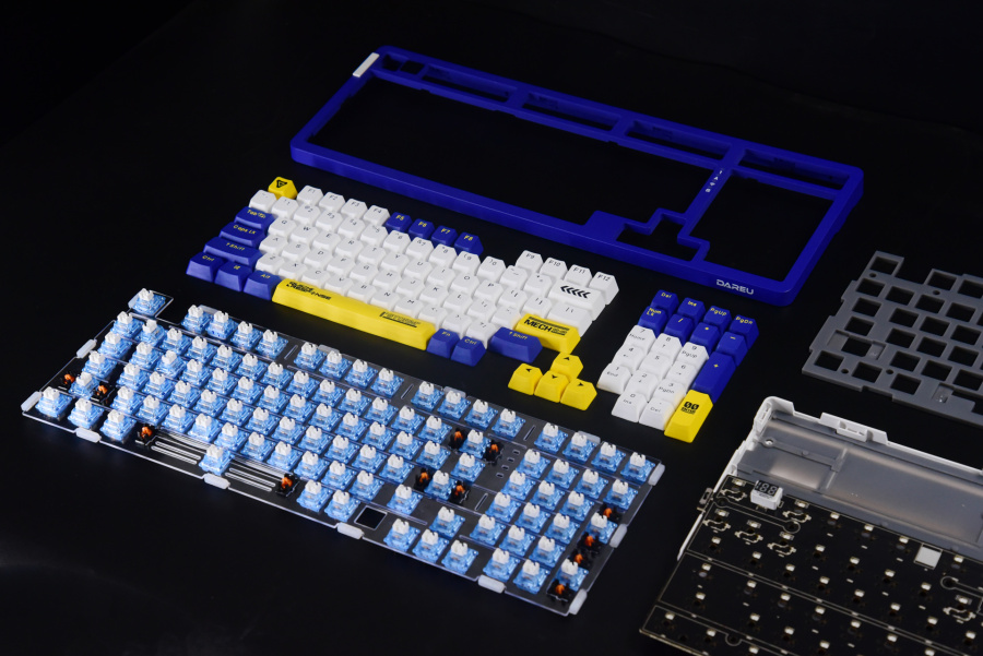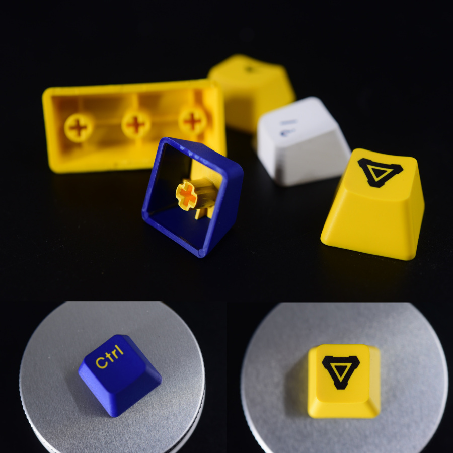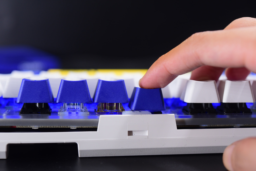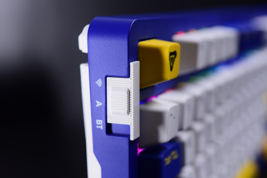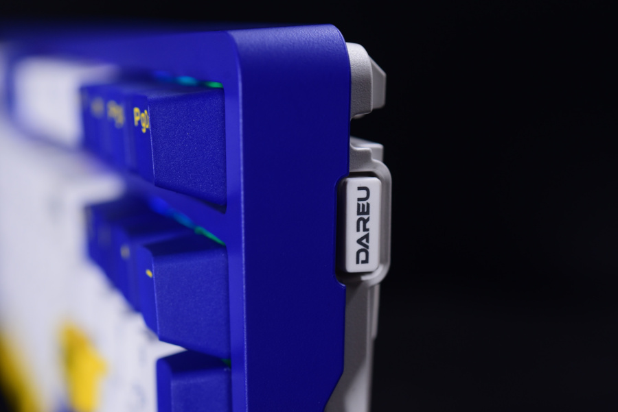 而外观方面则是蓝白搭配,辅以几个黄色的个性键帽组合,营造机甲风,个人感觉除了这几个键帽以外,上盖部分也可以加入一点设计,这样会给人更强的设计感,也让我感觉物超所值。