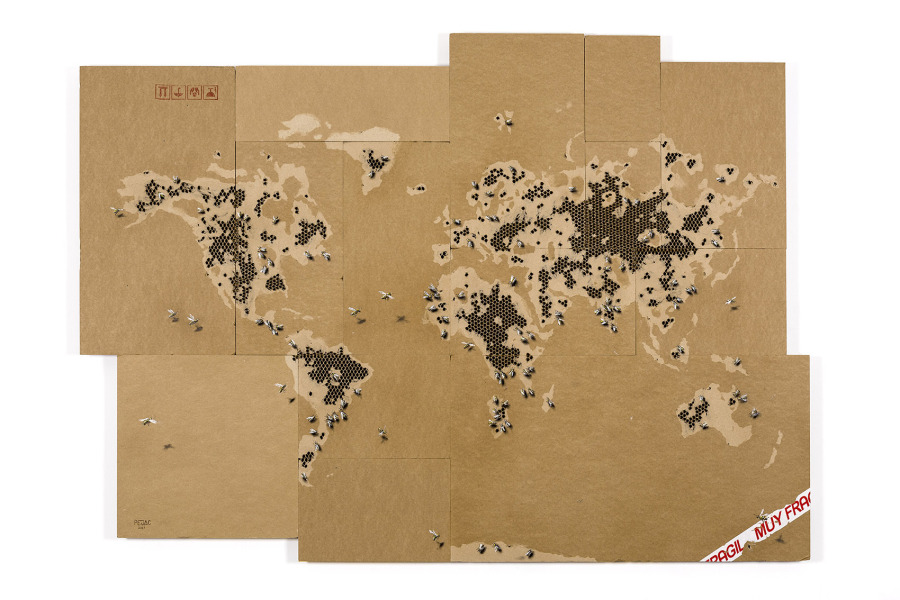 Having at his disposal eight different rooms and spaces, Pejac put on display over forty new artworks that literally came in all shapes and sizes. The smallest object that was part of APNEA, was a pencil sharpener containing the image of a prehistoric cave painting that could be observed only through a magnifying lens. By contrast, the largest installation on show was an enormous half-sunk paper boat with origami seagulls circling above, preying on cargo washed overboard.