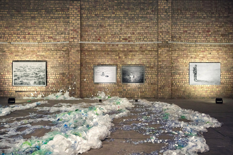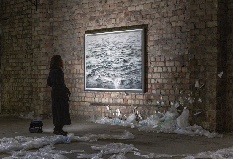 柏林寒冷的气温也无法阻挡人们观看展览的热情。这座昔日工厂本身就宛如一个想象的世界,参观者一进入便会沉浸在精心布置的视觉奇观中。但与此同时,很多作品又毫不犹豫地指向了现实世界中两个最紧迫的问题:环境污染和气候变化。“如果现在不采取行动,人类将陷入更大的困境。”“呼吸暂停”的主题也恰好契合了COP26格拉斯哥联合国气候变化会议的议题。Pejac以自己的艺术手法表达了对环境问题的关注,拉长的垃圾袋经过精心布置,构成了海浪冲击岸边的图景。