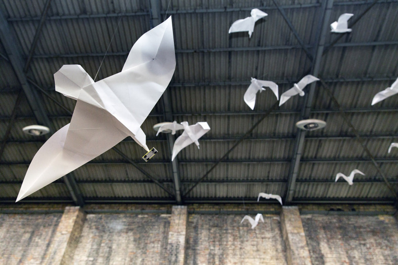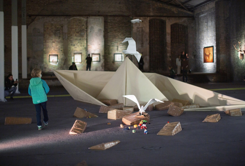 ▼最大的展品,海鸥与沉船,the largest installation, half-sunk paper boat and seagulls ©PEJAC