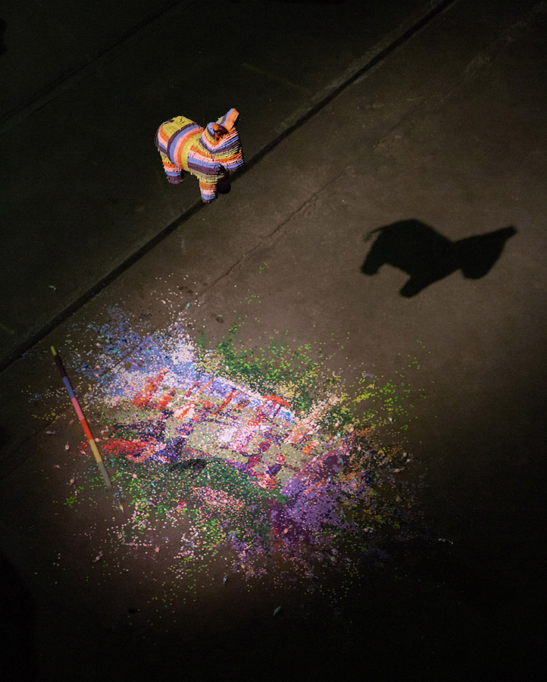 While most works on the walls featured desaturated tones, the astonishing rendition on the floor of Georges Seurat’s La Grande Jatte made up of confetti and wrapped sweets could not be described as anything but an explosion of colour.