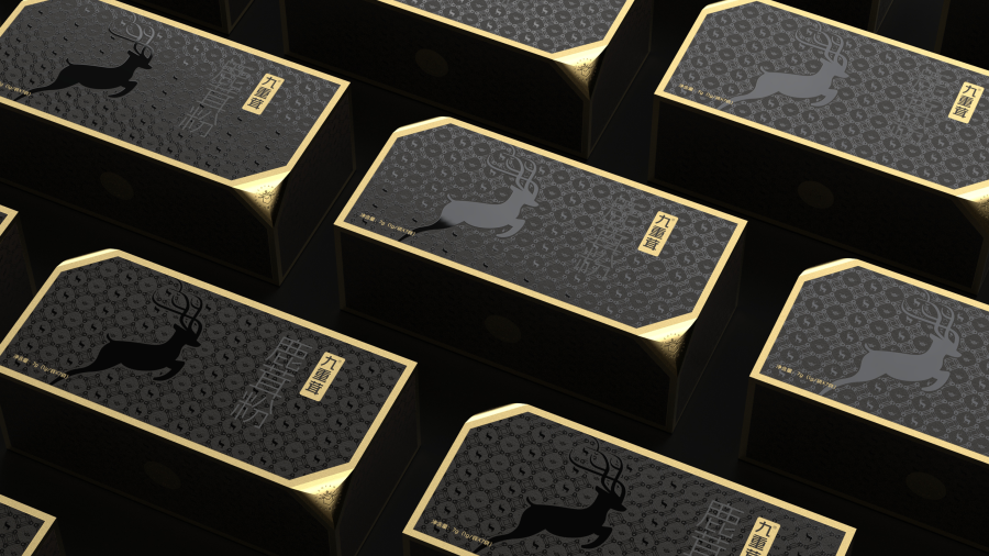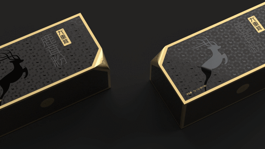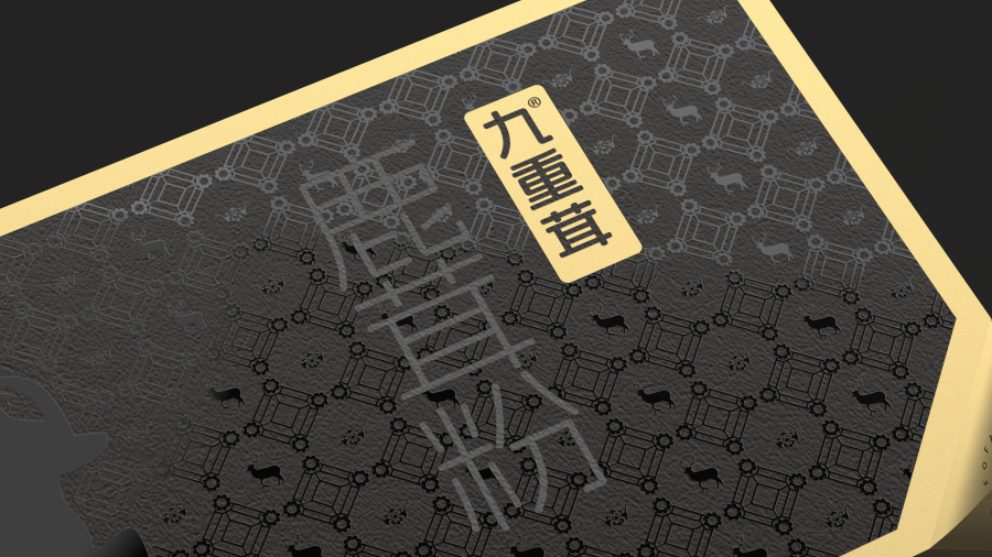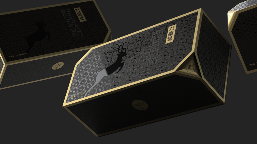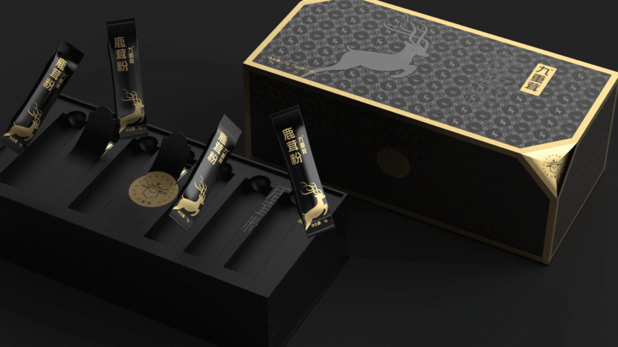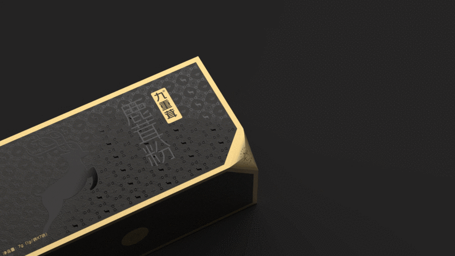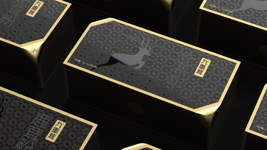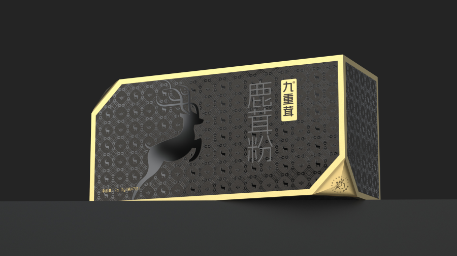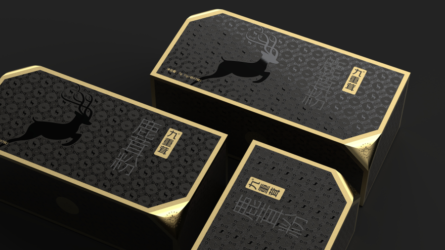 在快节奏的现代生活中,包装设计应着重考虑使用者的便捷性。推出易于携带、便于食用的药食同源类产品,如含片、粉末状等,如九重茸鹿茸粉,巧妙的利用制作工艺能够实现的切角处理,使盒型呈现出独具一格的个性,盒子切角位置粘贴金属牌使特点更为突出,更能够吸引眼球,让消费者无论身处何地都能轻松享受到产品的美味与健康,从而更好地融入快节奏的生活方式之中。