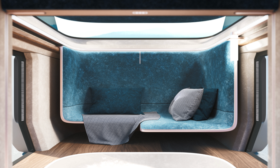 除此之外,在车顶还有两组沙发座椅,并能自动升降。