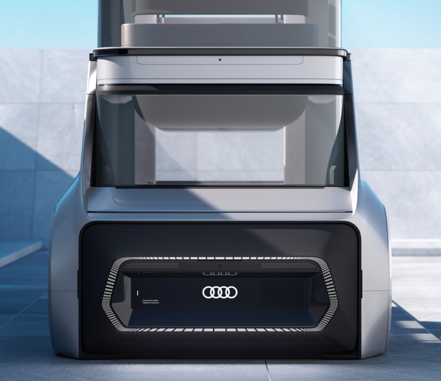 车头前面配有矩阵式LED大灯,以及发光的奥迪标识。
