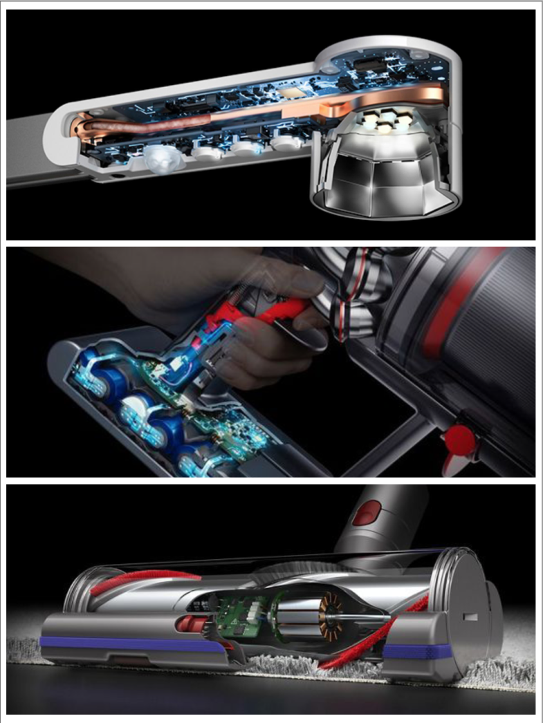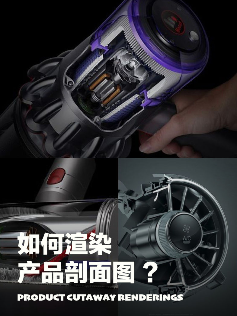 剖面图可以更直观地去表达产品的内部结构及运作原理。设计师需要通过产品的剖面图更好地进行阐述。P4是戴森的宣传图,由于品牌强调的就是内部结构及工程原理,所以戴森所制作的渲染图皆在突出产品强大的内在功能。(如智能灯光控制组件,持久稳定的电池续航,强劲高效的无刷电机驱动等)