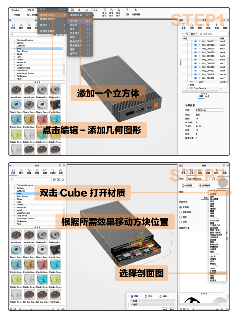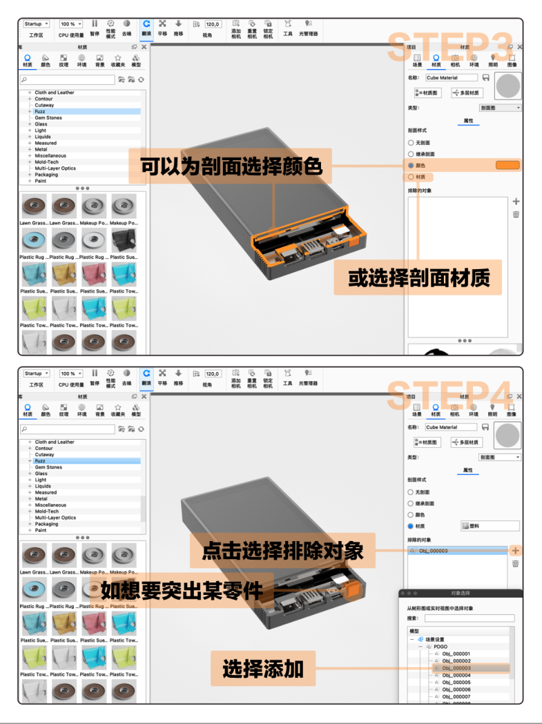 🟠 首先在keyshot顶部找到“编辑”-添加几何物体-正方体(也可以用别的集合体 取决于最终想要表达的效果)。打开新建几何体的材质,选择剖面图/Cutway。原理和布尔运算求差类似,移动立方体调整位置。如需要突出剖面,也可以为剖面添加材质或更为醒目的颜色。如想要完整展示某一个内部零件,则需要点击排除对象,选择那个部件(p3我选择突出橙色按钮为例)。