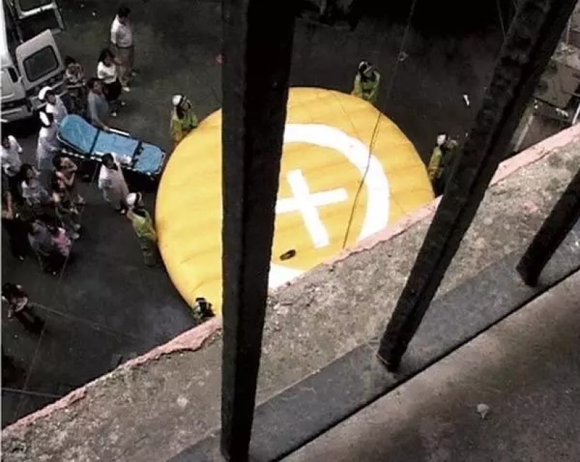 镜消防队员飞速摆开气垫紧张地营救中