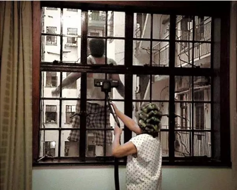 原来老太正使用伊莱克斯吸尘器打扫窗户