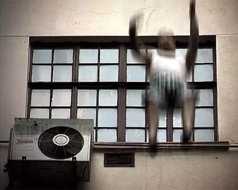 胖男子仰面地被粘贴在大楼中央的玻璃窗户上