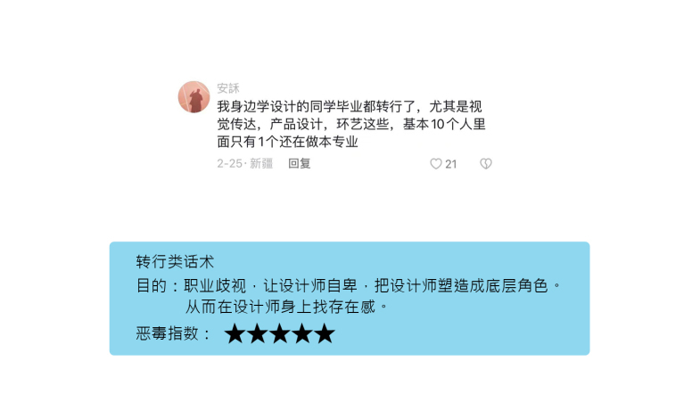 大家请看下,我在网络上随便抓取的一些话术,相信每个人都会刷到。几十年来,对设计人群的打压,欺负,PUA,无处不在,可以说已经多到无孔不入的地步。