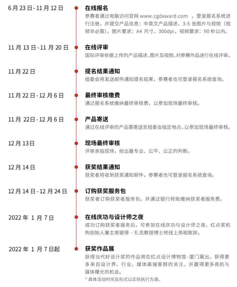 2021年当代好设计奖于6月23日启动全球征件,目前已进入追加报名阶段,报名将于11月12日截止。11月13日-11月20日国际评审团将对参赛作品进行在线评审,12月13日由评审进行现场最终审核,并于2022年1月7日举办在线庆功与设计师之夜。