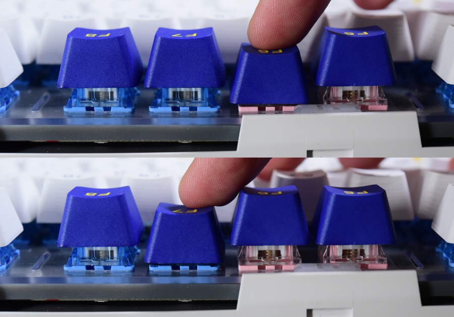 糖轴的手感特色,有弹性、回弹强;gasket结构的A98手感特点,内部去空腔化加软韧材质堆叠,大家都是韧性十足,加起来就更能还原那种弹性十足的手感了。之前就觉得A98很适合线性轴,而现在搭上一样以弹性为卖点的糖果轴后,果然效果和预期一样,可以说是最搭达尔优A98的一款机械轴了。