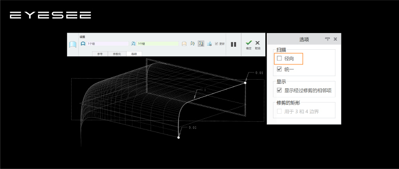 6、还是在造型工具中单轨单截面创建曲面,注意选项中将径向的对好