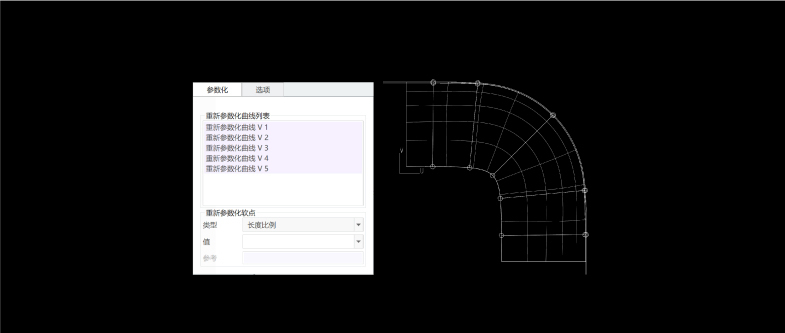 那我们重新参数化,如图增加参数化曲线,其实就是改变UV线的分布;