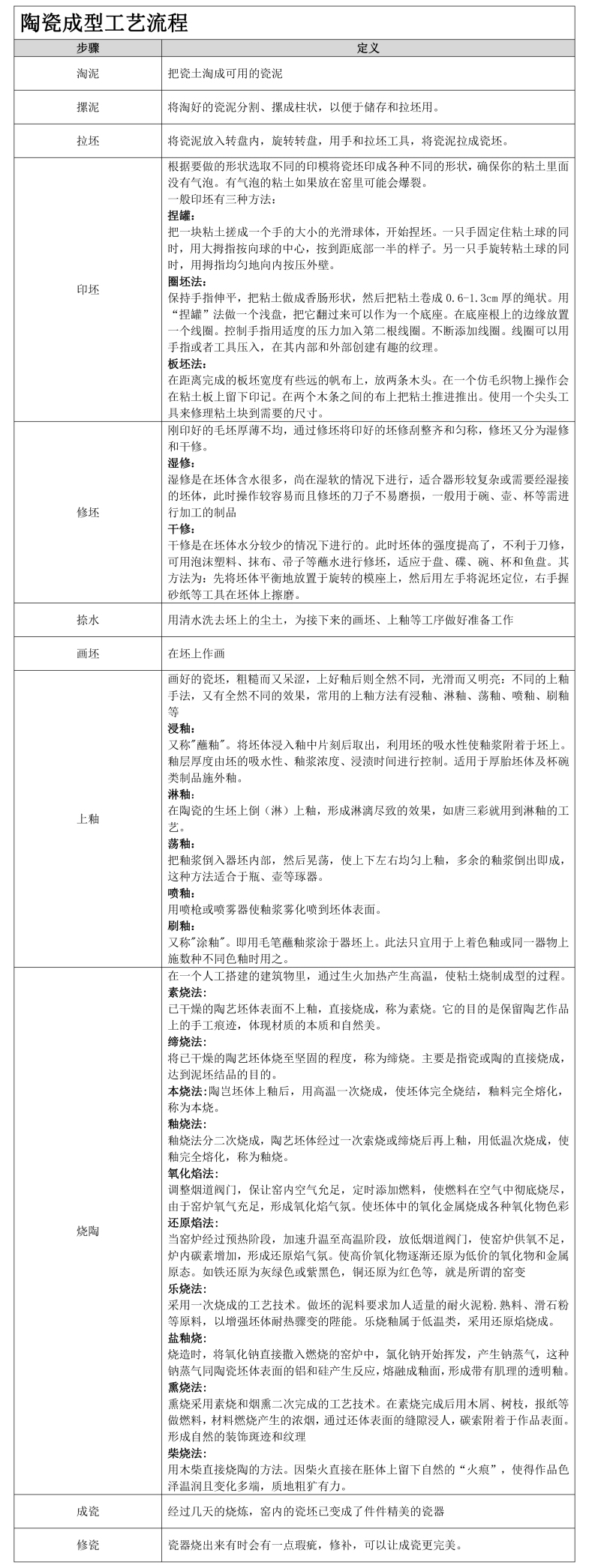 • 陶瓷产品的生产过程是指从投入原料开始,一直到把陶瓷产品生产出来为止的全过程。包括坯料制造、坯体成型、瓷器烧结等多个基本阶段。如下图: