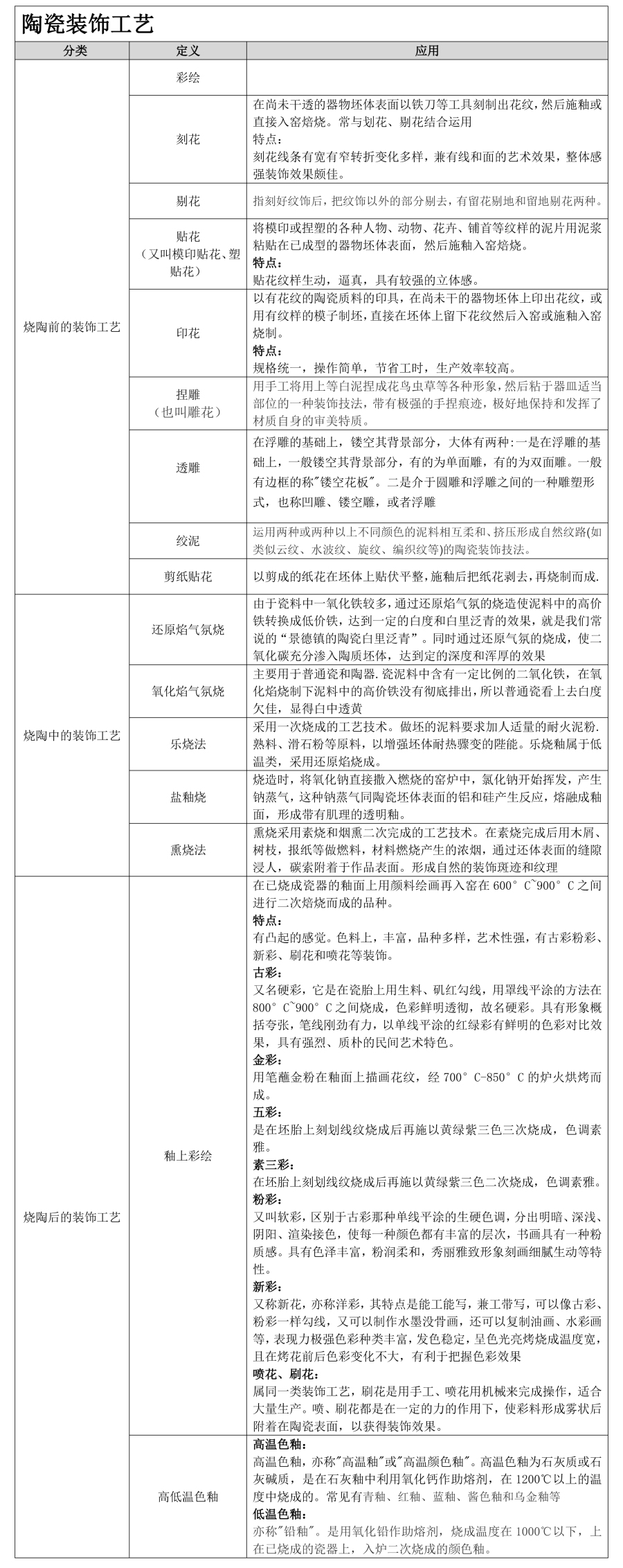 • 装饰是对陶瓷器进行艺术加工的重要手段。它对提高器物的外观质量、丰富文化生活起着积极有效的作用。可分为三大类,一类是烧陶前在生坯胎上进行装饰,二类是在烧陶过程中完成装饰,三类是在烧造好的陶艺坯胎表面上装饰。如下图: