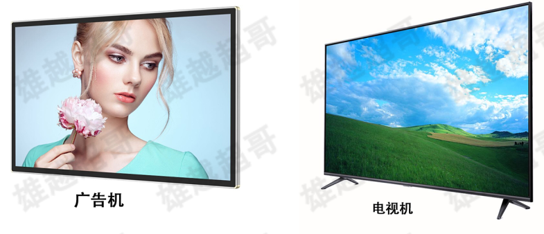 广告机和电视机的差别是什么呢?这是一个老生常谈的问题,二十年前,我刚从业的时候很多行业人士问过我,最近一个从业十来年的商显销冠,也问上海雄越超哥,我十分惊讶,正好最近上海雄越超哥在琢磨,作为从业近二十年的商显行业老兵,上海雄越超哥想写点行业文章,把自己的行业经验、从业经历和大家分享,正好借此机会,上海雄越超哥和大家普及一下行业知识。本文主要讲述普通广告机和电视机的差别,因为广告机范围比较广,有室内外之分,触摸非触摸之分等等,这些明眼人很容易分辨,不在此次描述范围内。本文仅仅探讨如上图所示的广告机和电视机差别。