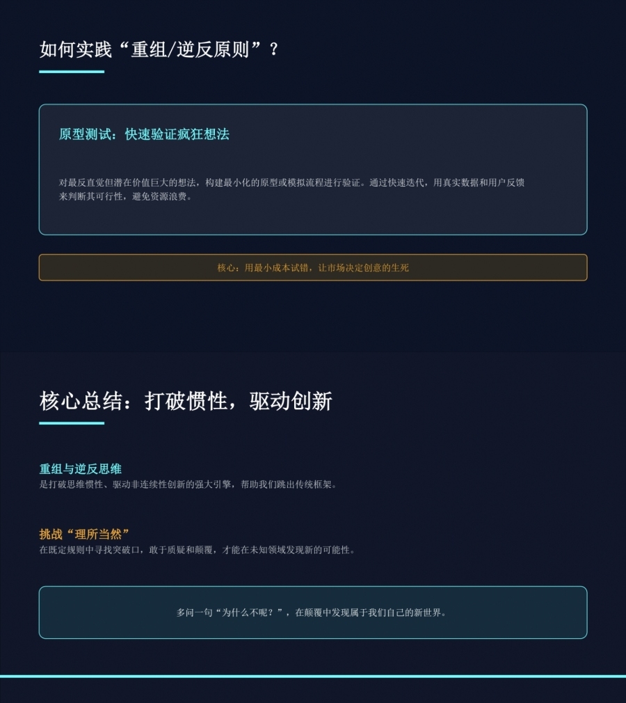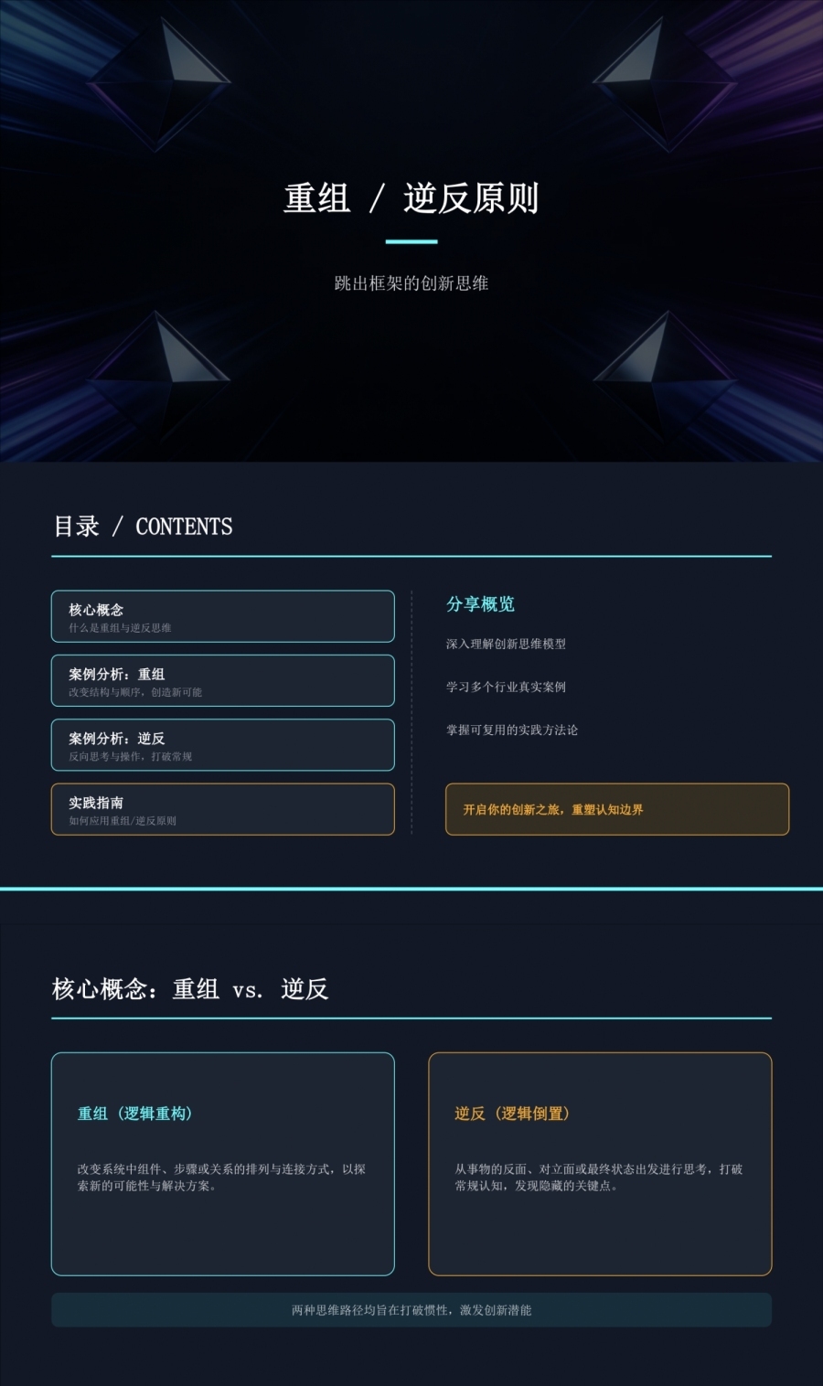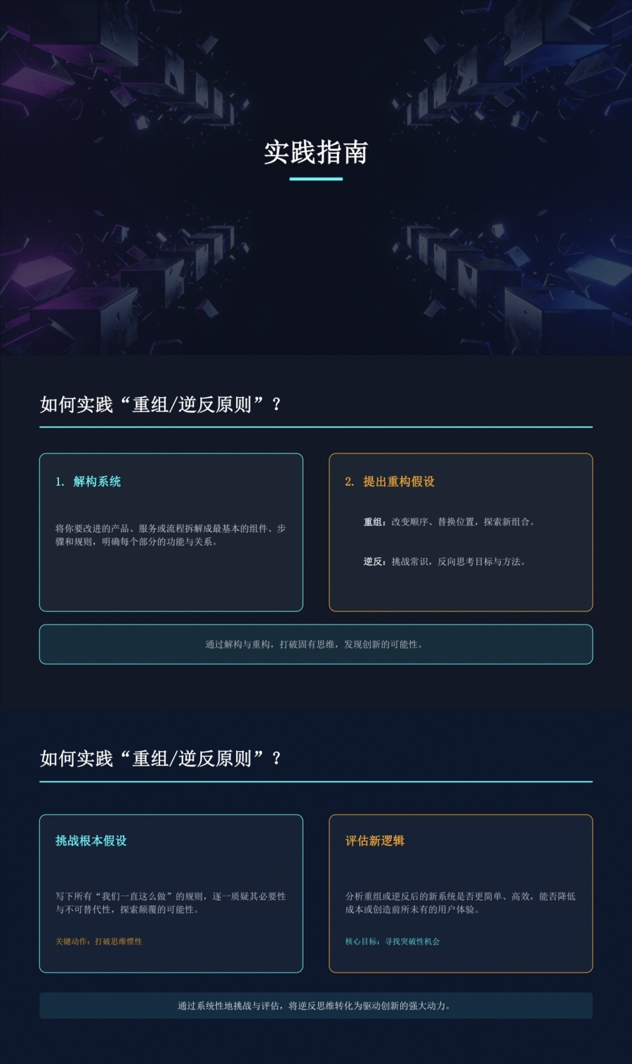 这套「重组/逆反原则」,正是一套能帮你系统性提升创造力的思维框架。它的核心,是跳出默认的线性思维定式,通过打乱现有结构、重构逻辑关系的「重组」,与颠倒因果、反向推导、从对立面思考的「逆反」,帮你挑战固有假设、发现思维盲区,打造属于你的非对称优势。