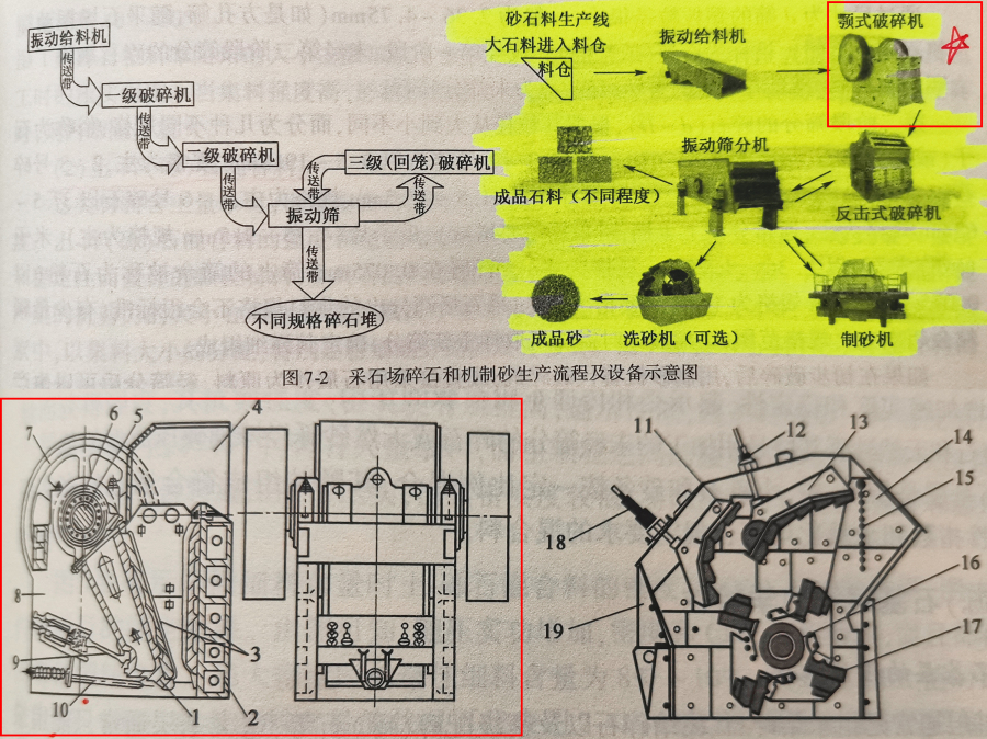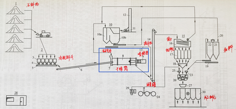 我同时神奇地发现了与道路工程那本书里类似的原料生产流程图。其中有一个重要环节,上图中蓝色的部分,烘干!为什么要烘干?去水!去水!去水!又是水。