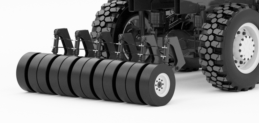 再来看看车子尾部增加的一排小轮子。这些就是轮胎压路机的缩小版排列。