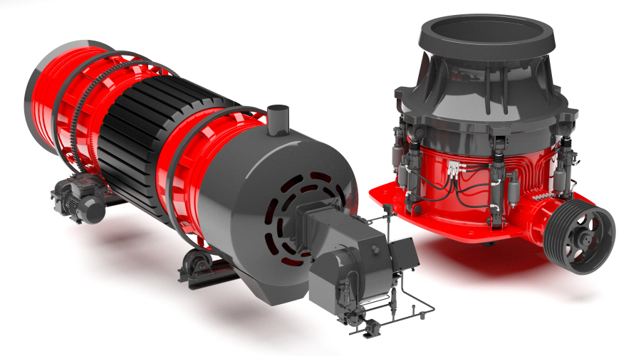 上图中左边是干燥筒和柴油燃烧器,右边不是颚式碎石机,而是圆锥碎石机。因为我查了一下沙砾的生产工艺,一般都需要两种碎石机进行两次碎石,才能把较大的石块碎成沙子。所以我下载了两种碎石机的模型。