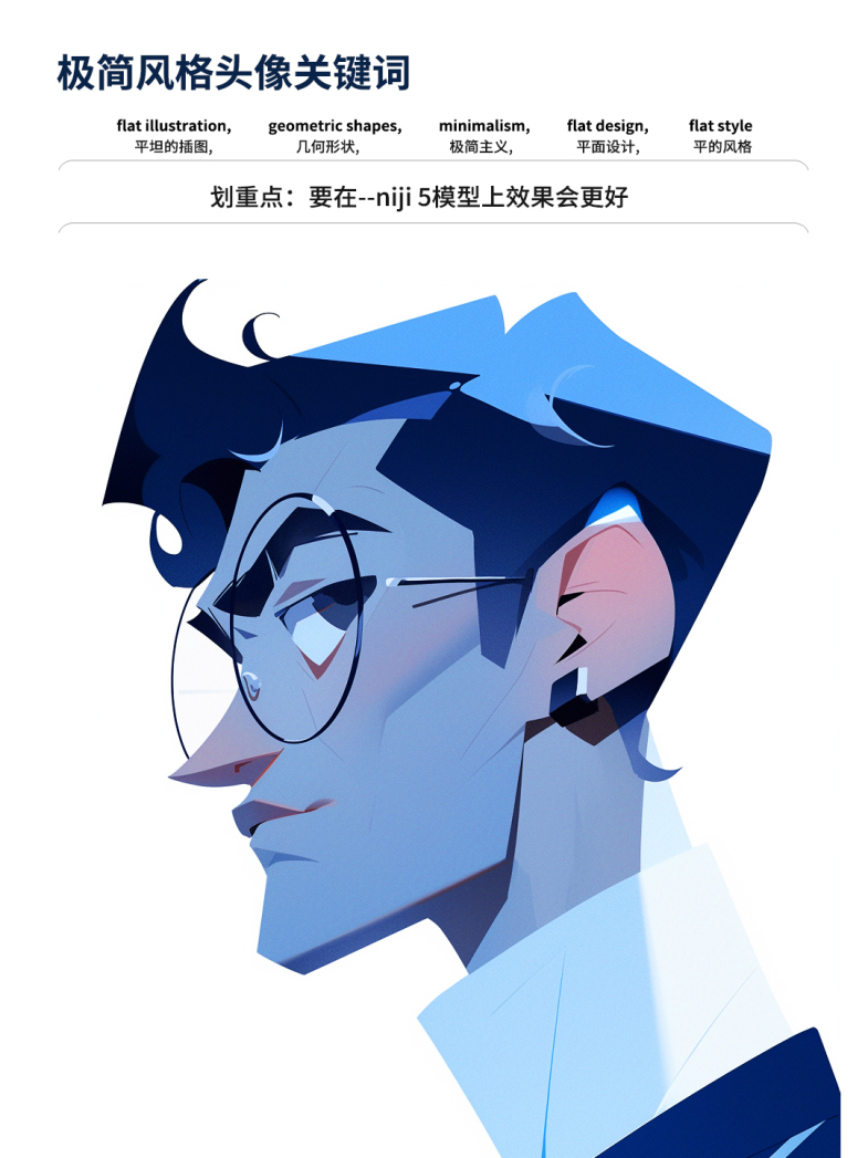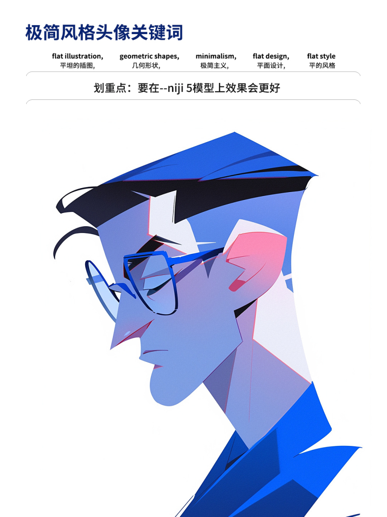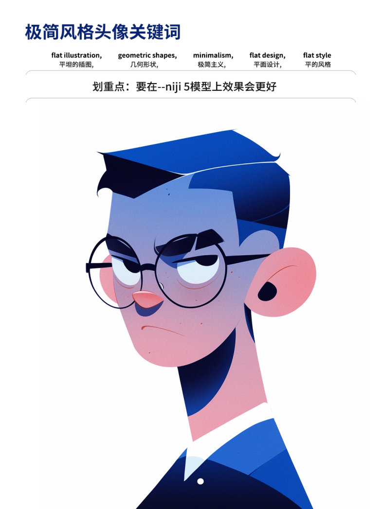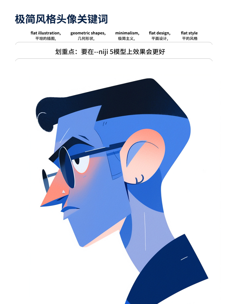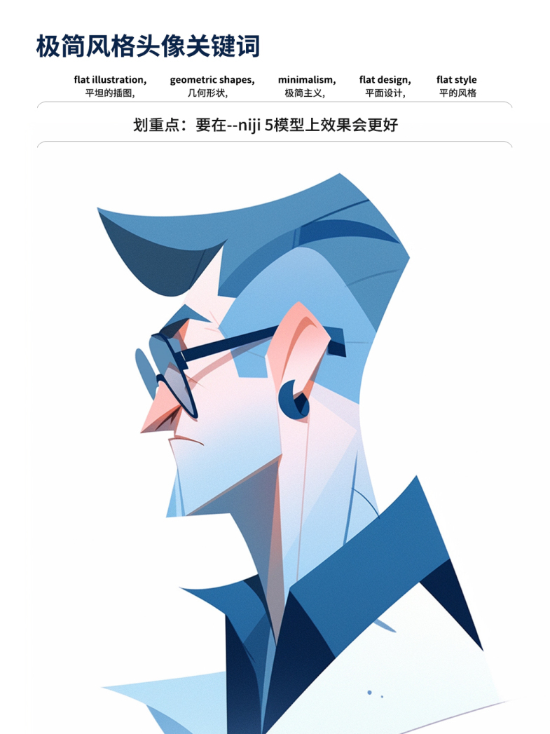第一、开头一定要用“平面插图”,后面再加上“扁平风格 、几何形状、极简主义"辅助;