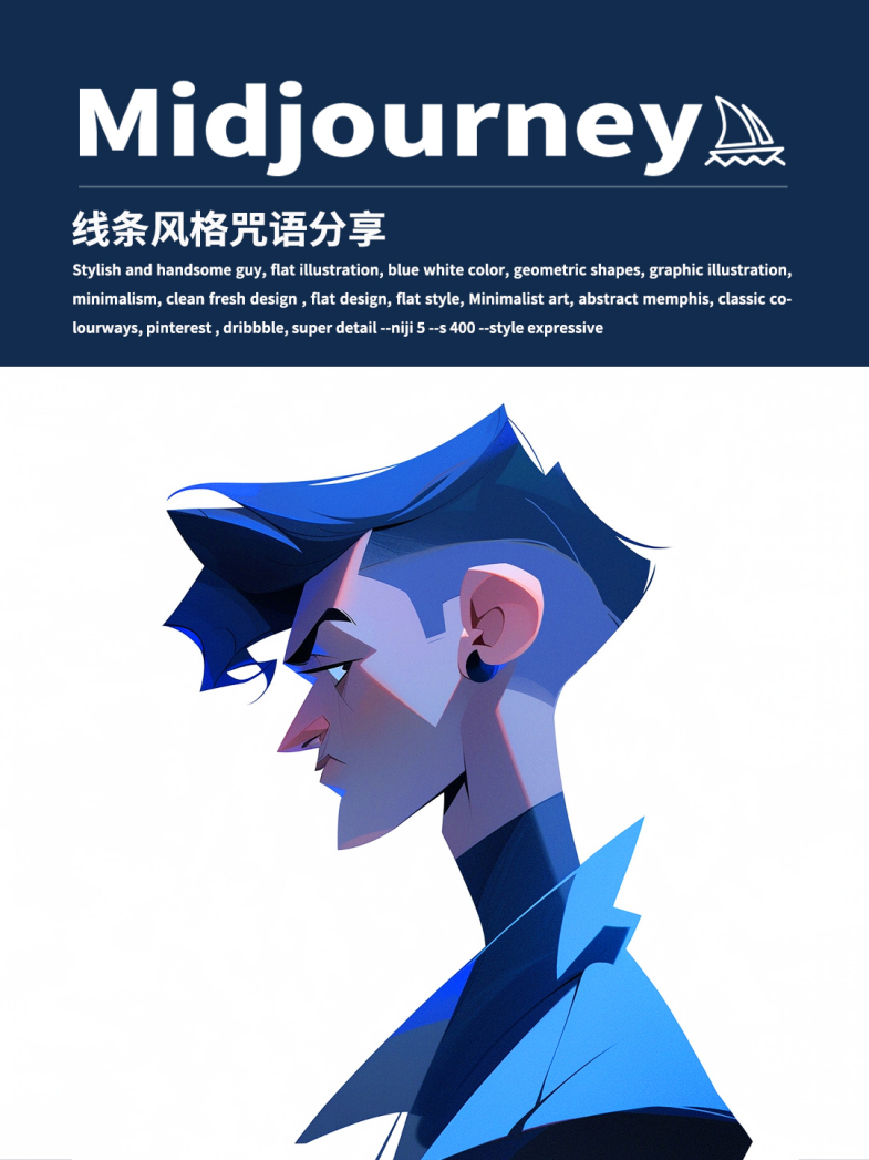 Stylish and handsome guy, flat illustration, blue white color, geometric shapes, graphic illustration, minimalism, clean fresh design , flat design, flat style, Minimalist art, abstract memphis, classic colourways, pinterest , dribbble, super detail --niji 5 --s 400 --style expressive