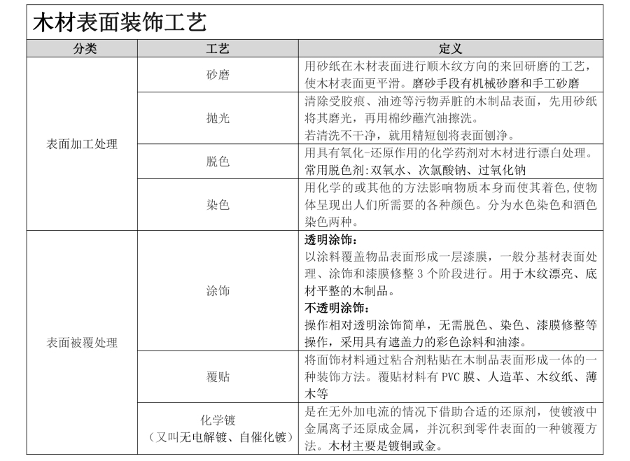 • 木材表面装饰工艺是指对木材及其制品按最终使用要求和视觉要求进行的表面加工处理过程。