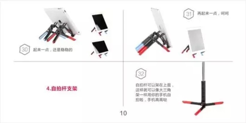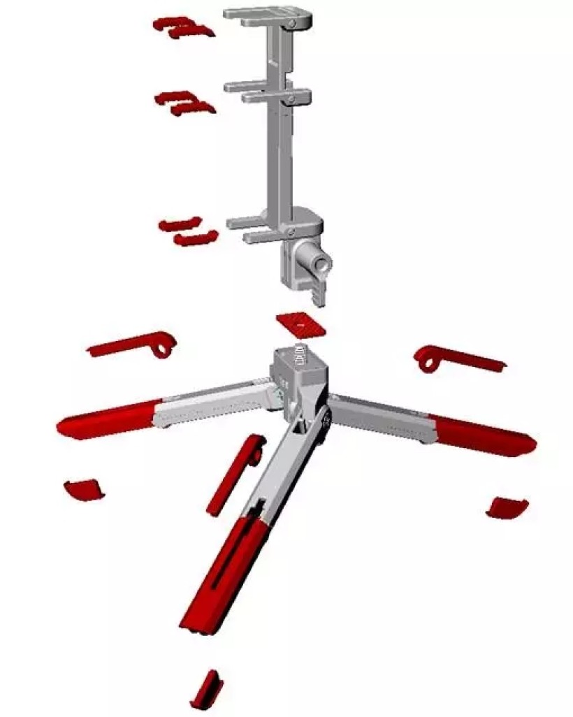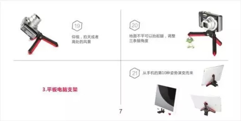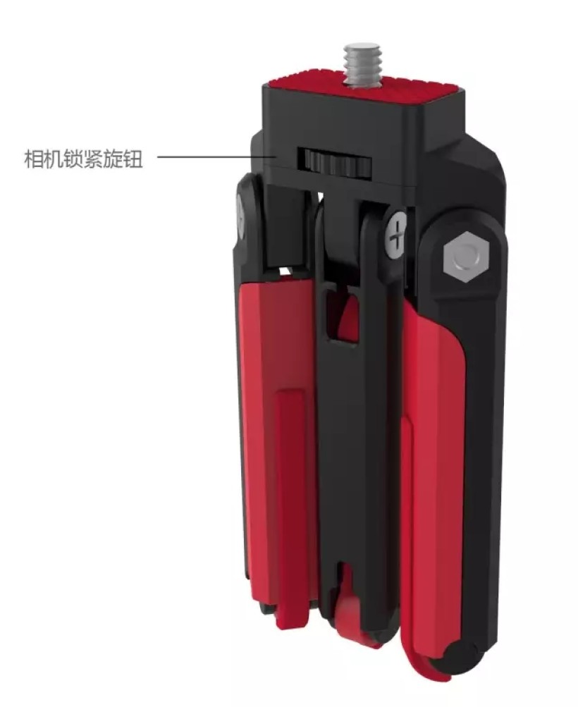 那么为什么不能把三条腿并排摆放呢?这样可以大大减小三脚架厚度,朝各自的方向打开,使用时形成三个分散的支撑点不就可以了。