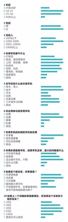可以看出,大多数人都会有手机不好支撑的麻烦,并且方便调角度和支的稳是必要条件,小巧和多用途就是锦上添花了,价格当然得亲民,三五十是最受欢迎的价位,这就是大概的设计方向了。