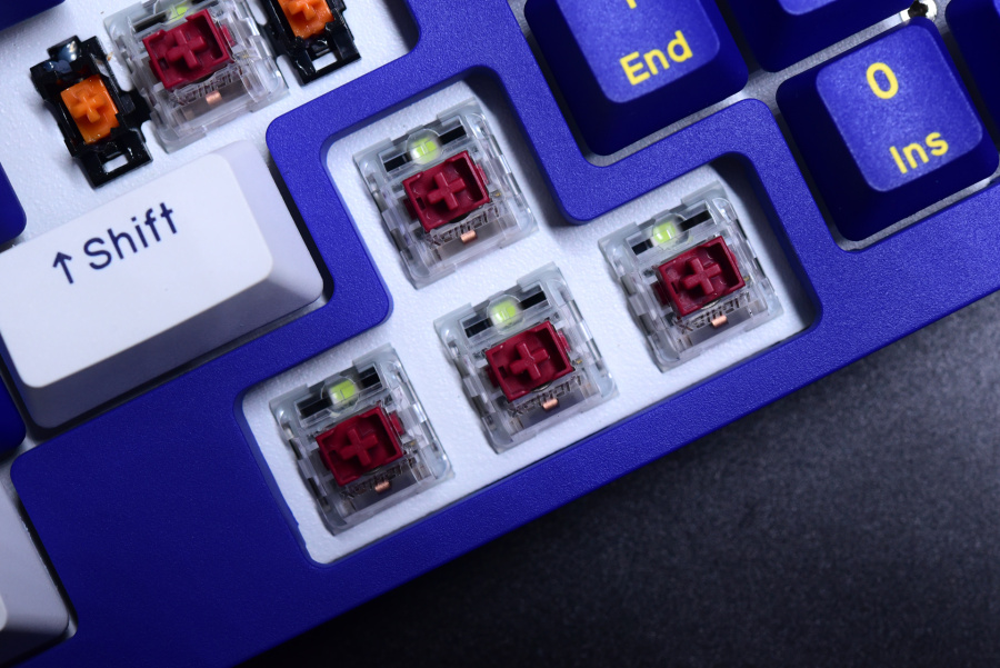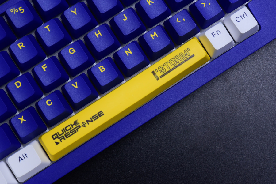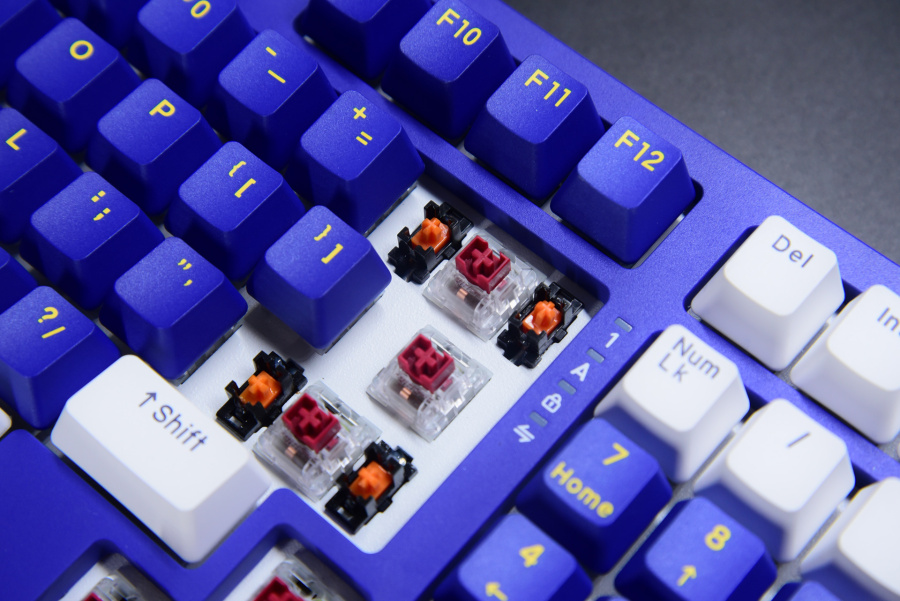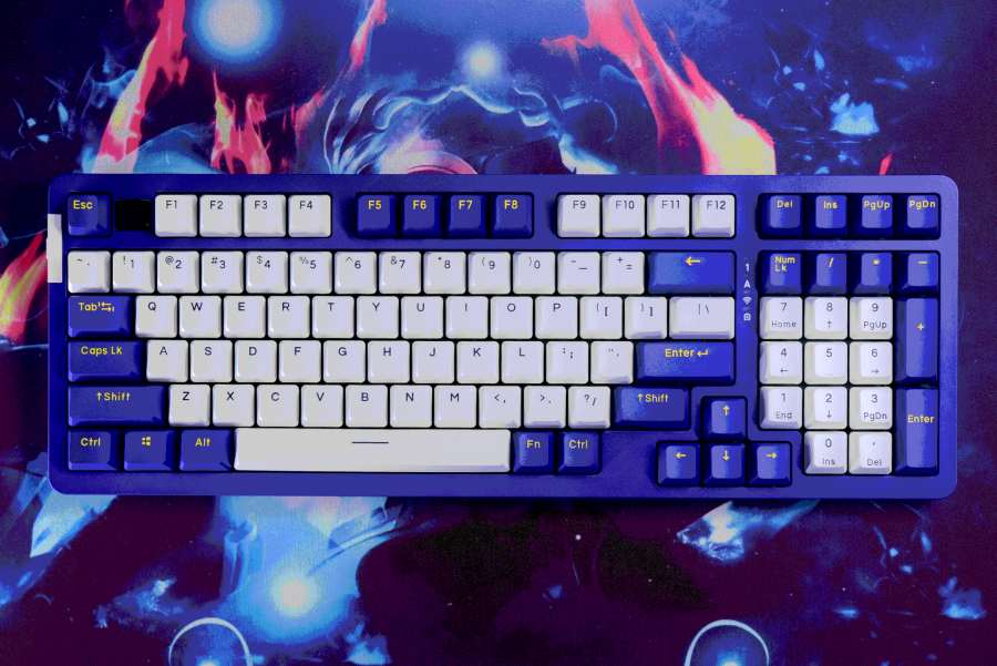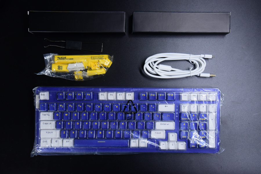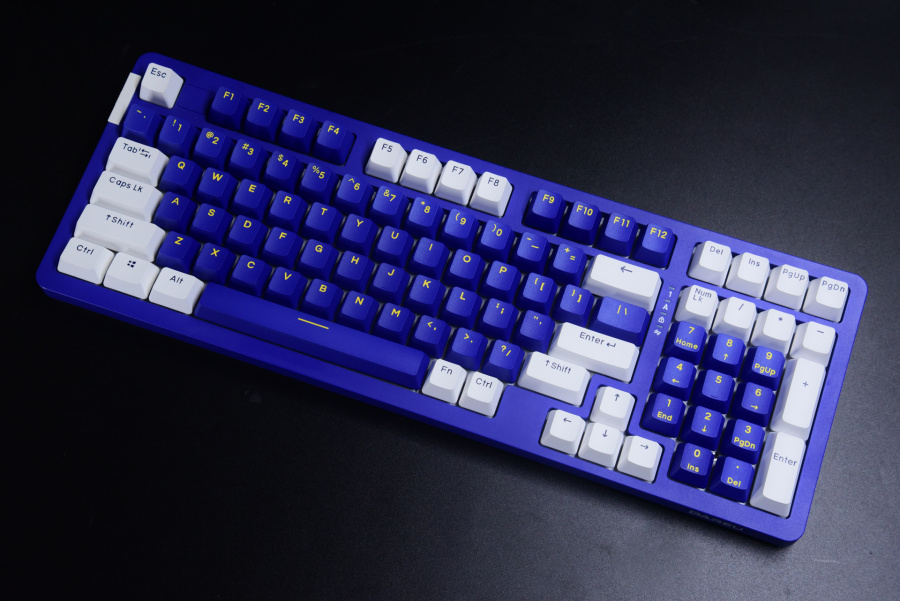 初始的蓝白配色键帽也不错,整体比较顺眼。这里发现了一个和gasket结构A98之间奇妙的联系点,静电容版本和gasket结构版本的键帽配色是刚好相反的,这可以理解为节省了键帽成本了。