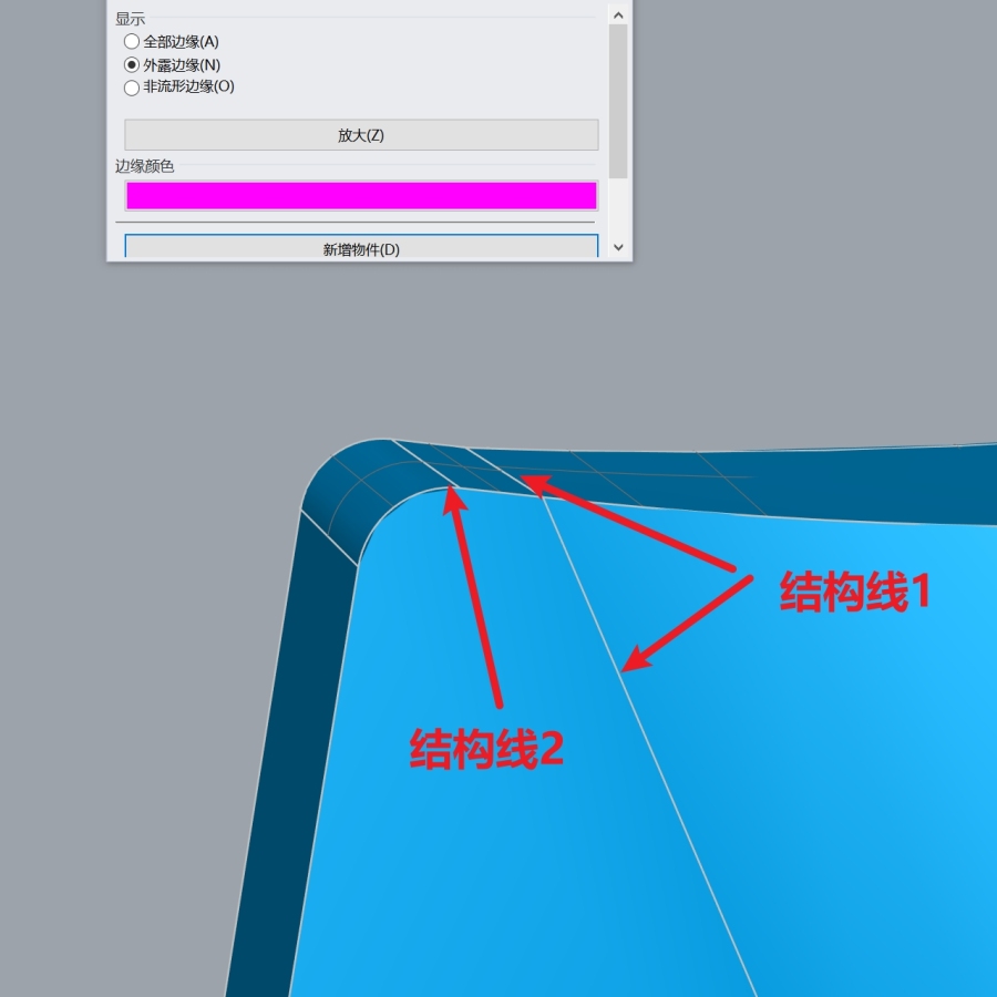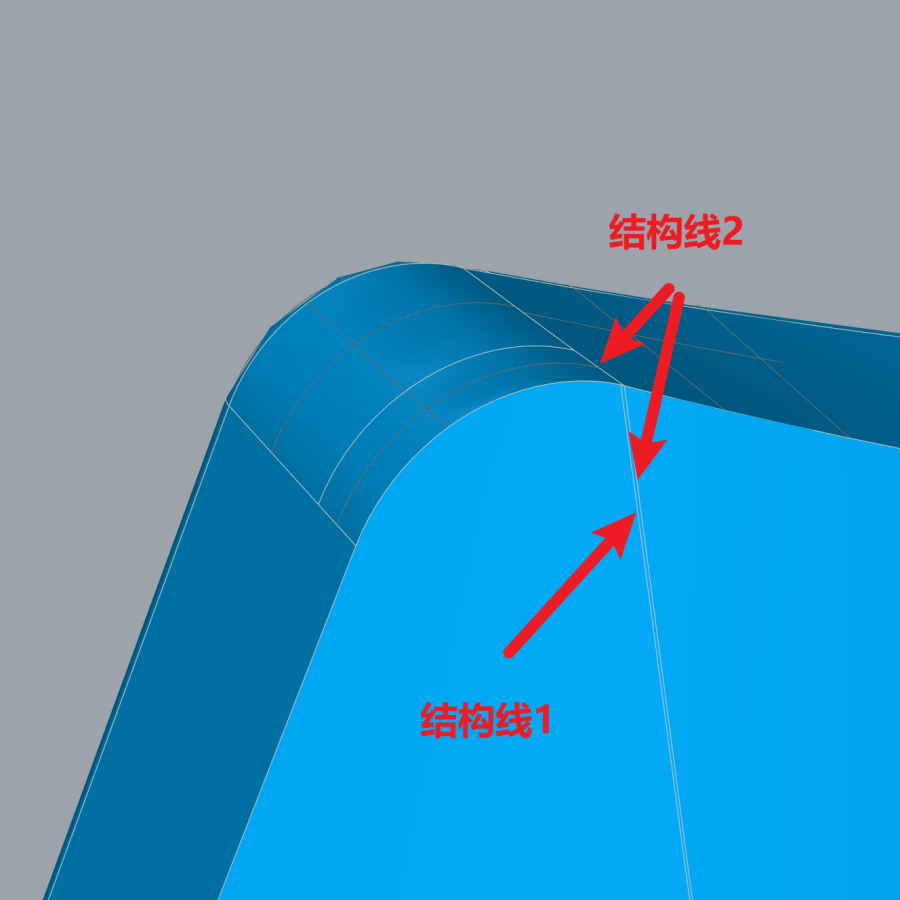 结构线2是越过了结构线1,在工程软件里是可以倒圆角的,但是在Rhino里是会失败的,这也是犀牛为人诟病的地方之一,复杂造型的倒圆角,或者倒大圆角很容易出现破面的现象。但是没办法,这是软件内核和机制不一样导致出现的现象,Rhino一时半会还是没有好的倒圆角方法。