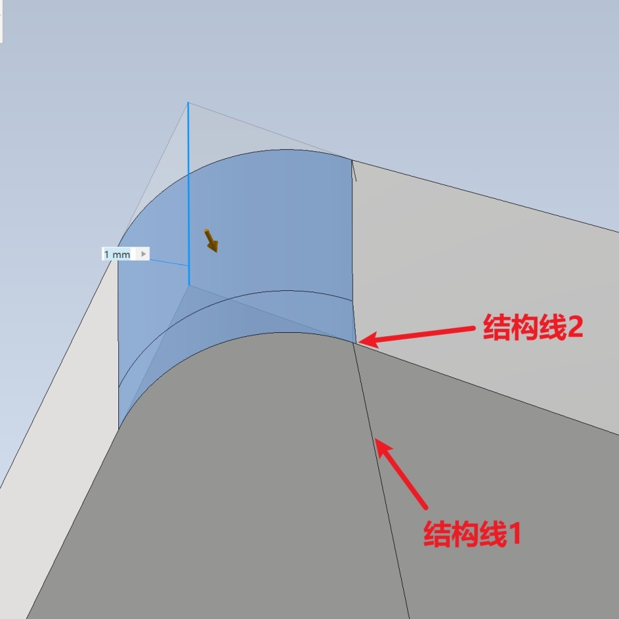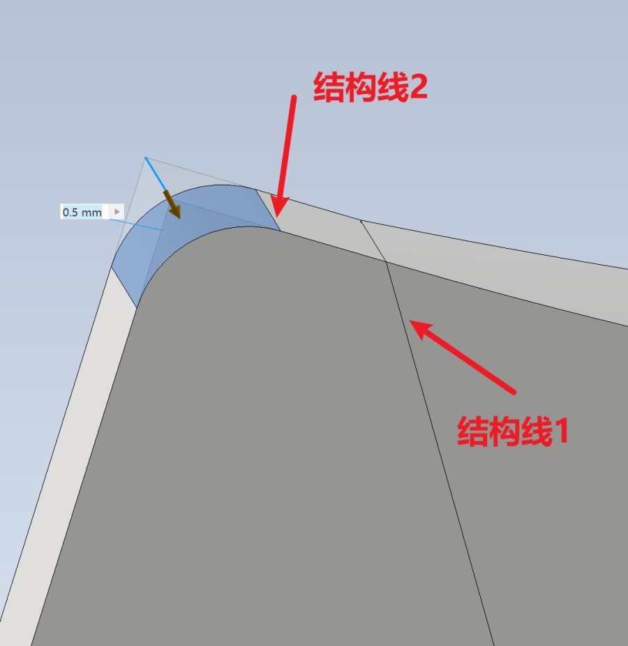 如果圆角缩小、优化,此时结构线1是在结构线2的右边,结构线是互不交叉,所以进行文件互导的时候,是不容易出现破面的情况的。