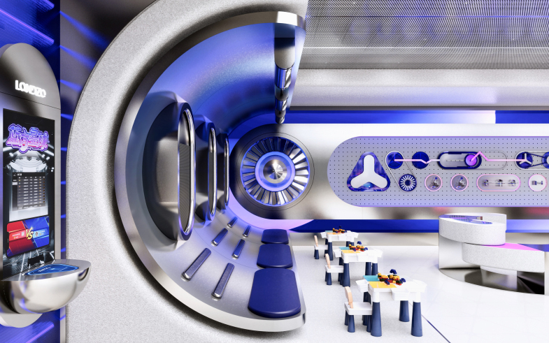 瑞德设计 · 空间为「蓝宙科技」打造了天才少年的未来灵感空间站,通过「超级场景」设计策略构建“学习+竞技+游戏”的高交互用户体验脚本,塑造儿童消费行业高端零售终端新模式。