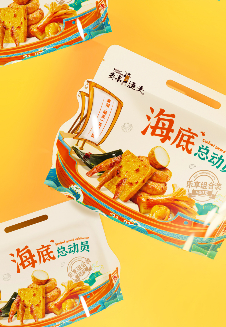 瑞德设计·品牌通过国潮插画的形式,将「炎亭渔夫」的品牌故事与海味零食的产品特征深度结合,打开包装即刻开启鲜味体验。