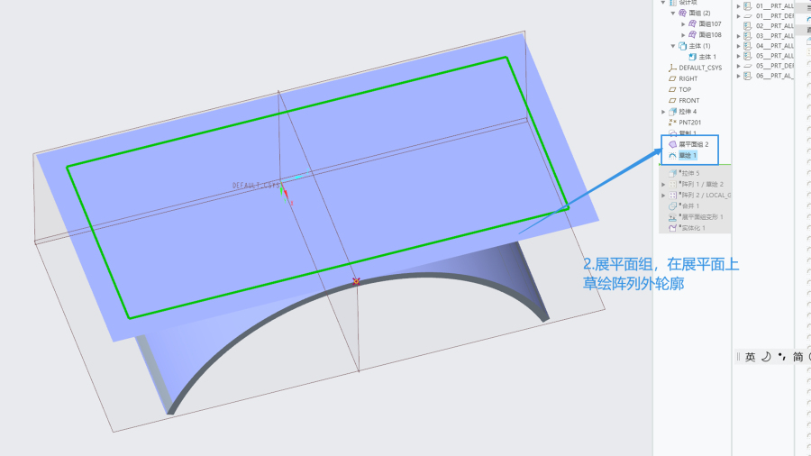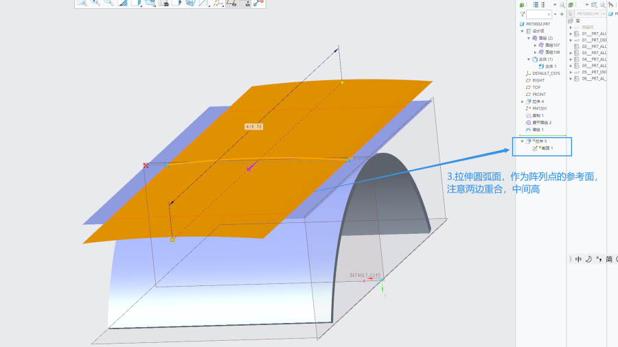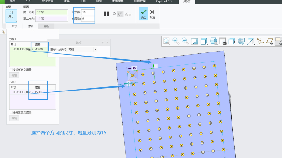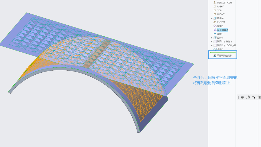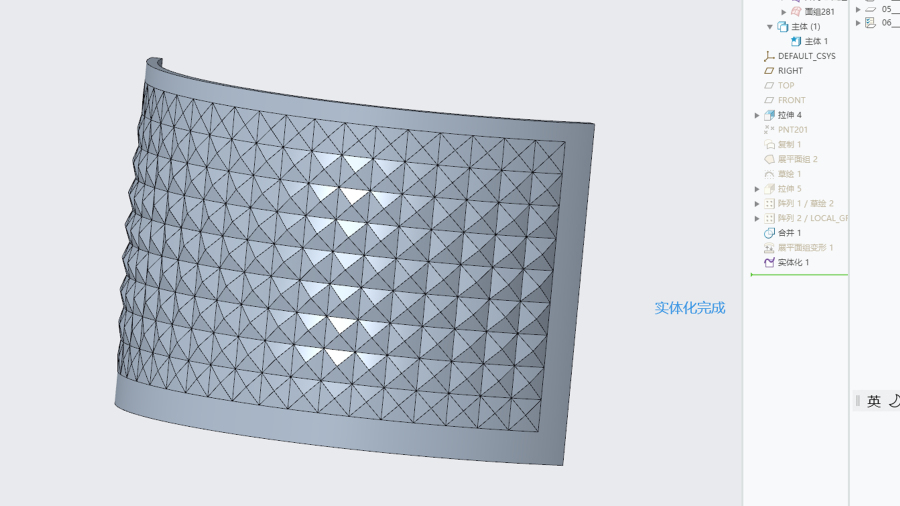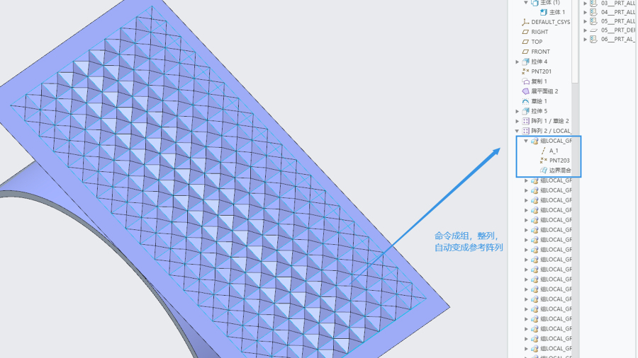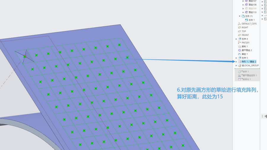 第二步,关于平面阵列,小特征尖角,越往中间越高,两边较低。此处可以用到尺寸阵列或是填充阵列。