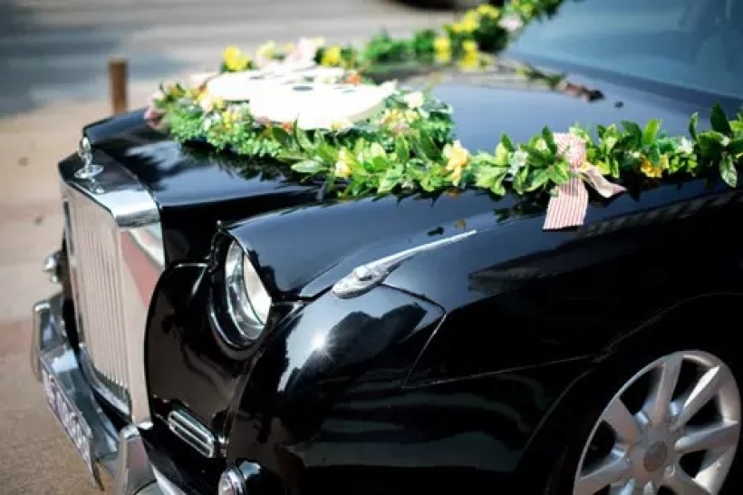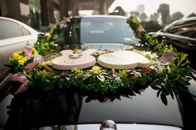 花圈是每部花车必备的重点道具。不知道是不是环保惯了,我不想要那种用完就扔掉的心型花圈,还插两只婚纱街的批发熊公仔上去,难看死了。我希望除了装饰车头,还可以外拍的时候也能用,婚礼完之后还能摆家里看。