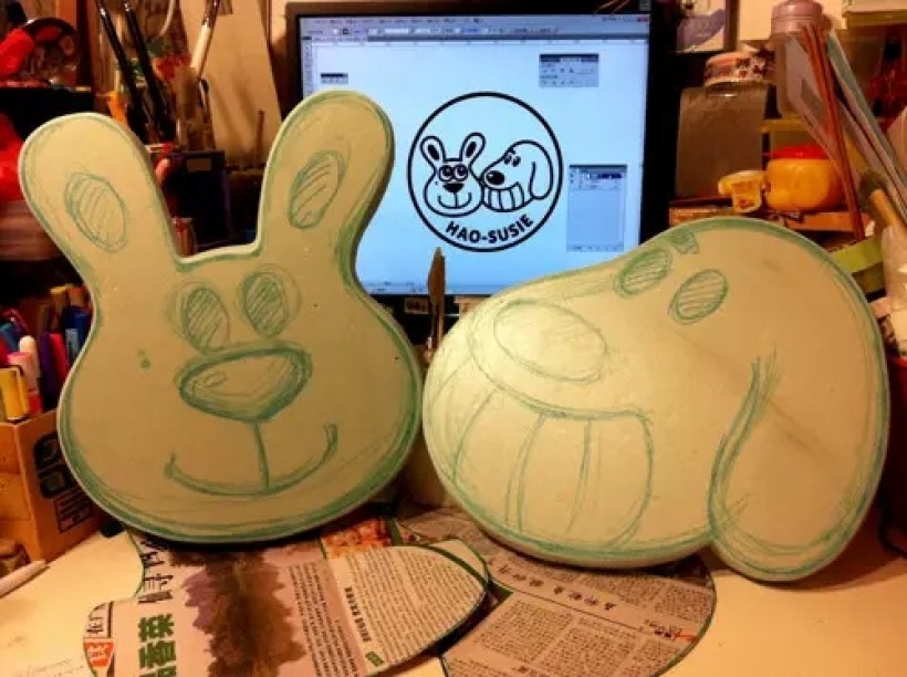 本来想用吉士跟沟屎兔的头拿下来放车头的,但是太高了,又难以固定,便做一个扁平的版本。还剩一块高密度泡沫,就用了吧。画这么大个头像,比在笔记本上画爽多了。